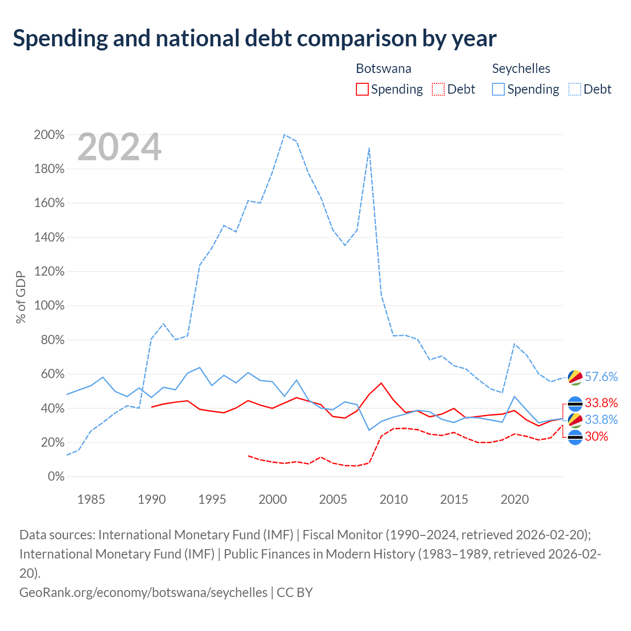 Botswana has $5.82B in government debt (30% of GDP), compared to $1.25B (57.6% of GDP) in the Seychelles.