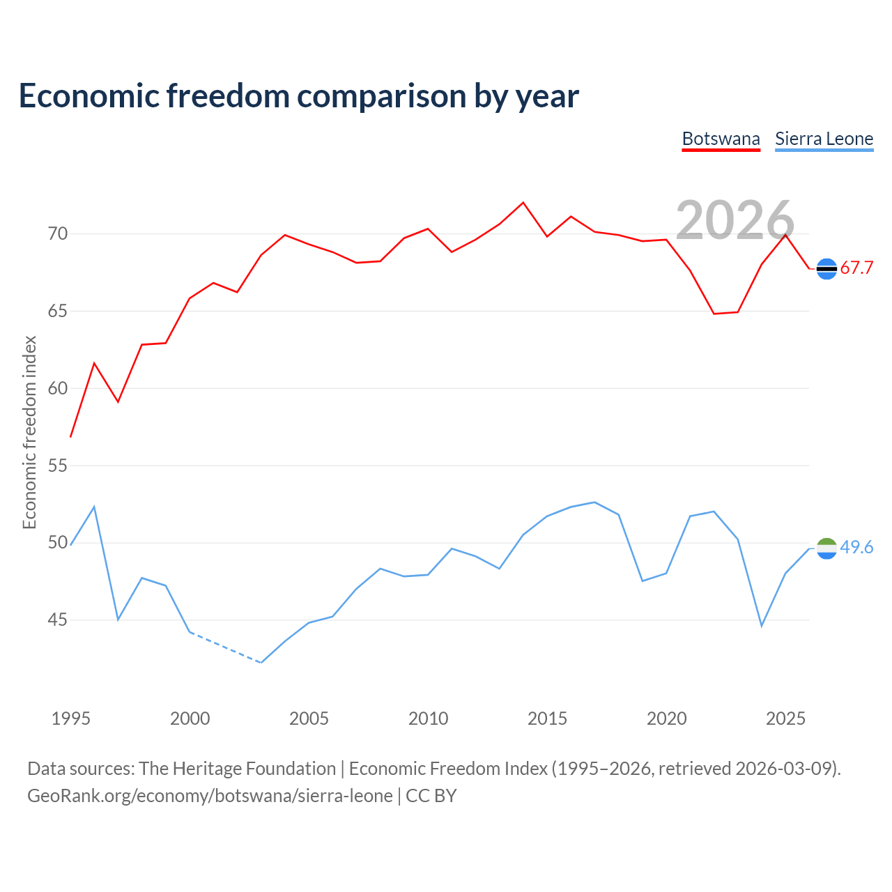 The Economic Freedom Index for Botswana is 67.7, ranking 53/197, compared to 49.6 for Sierra Leone, ranking 165/197. The chart above displays a comparison of annual changes in economic freedom indexes.