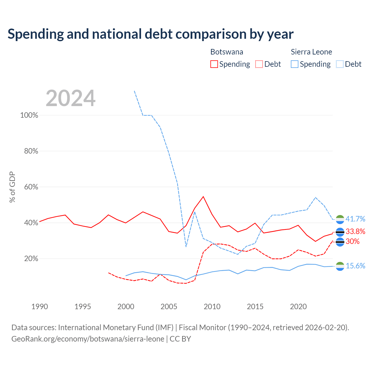 Botswana has $5.82B in government debt (30% of GDP), compared to $2.91B (41.7% of GDP) in Sierra Leone.