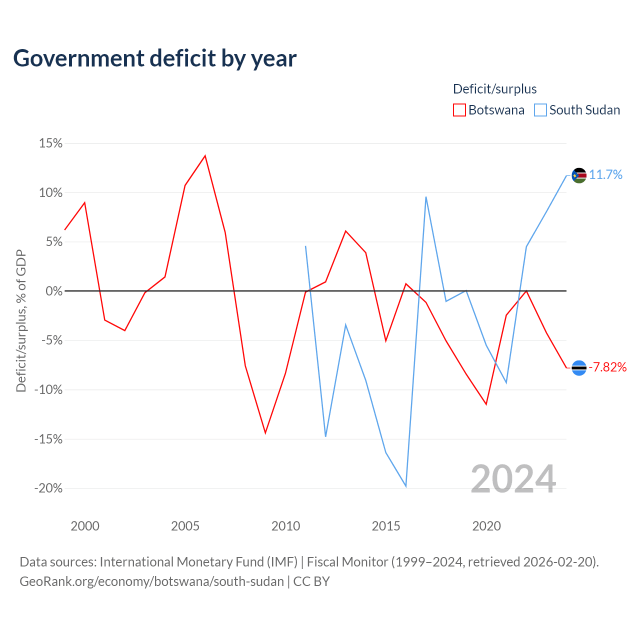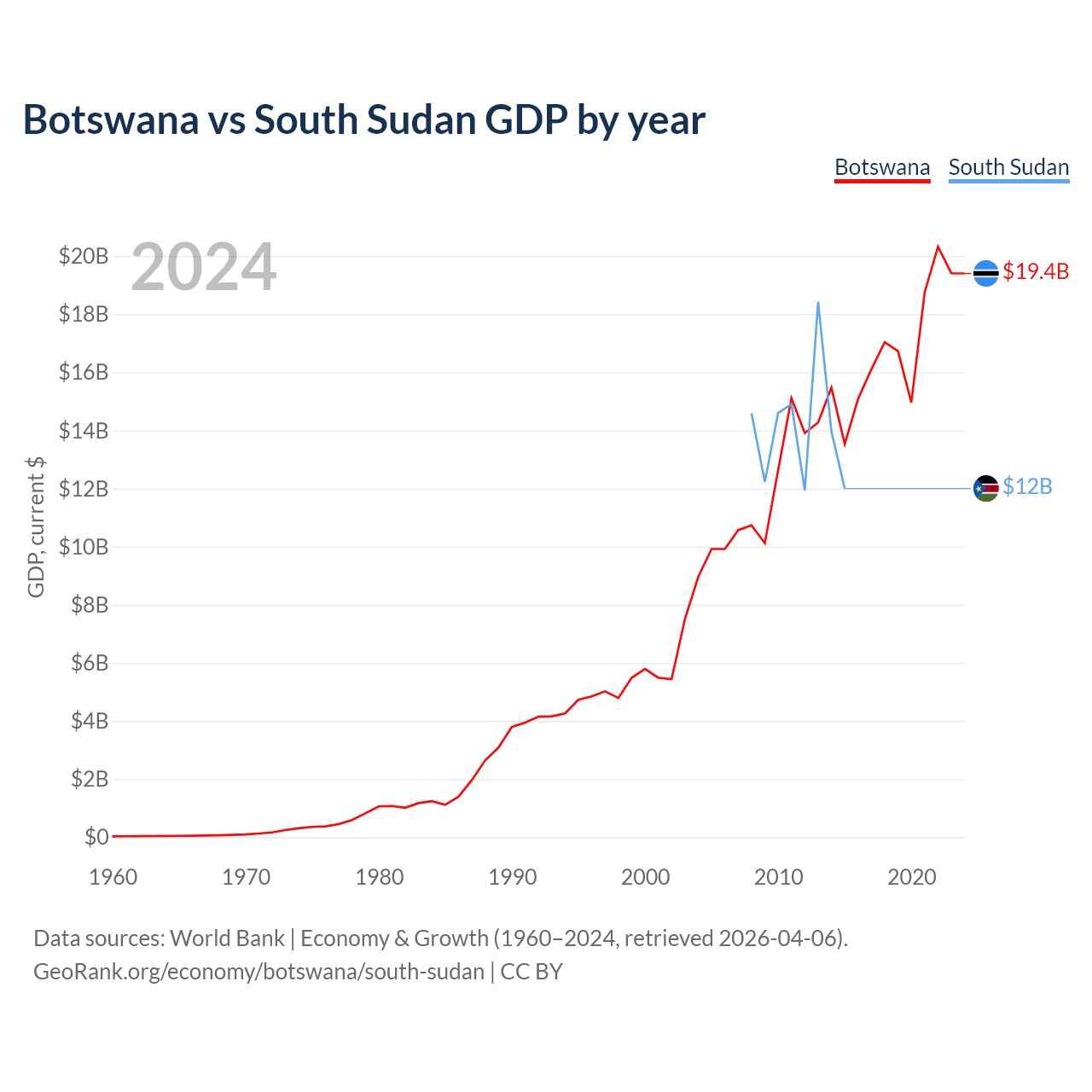 Botswana has a GDP of $19.4B compared to $12B for South Sudan, ranking 133/197 and 149/197 by economy size, respectively.