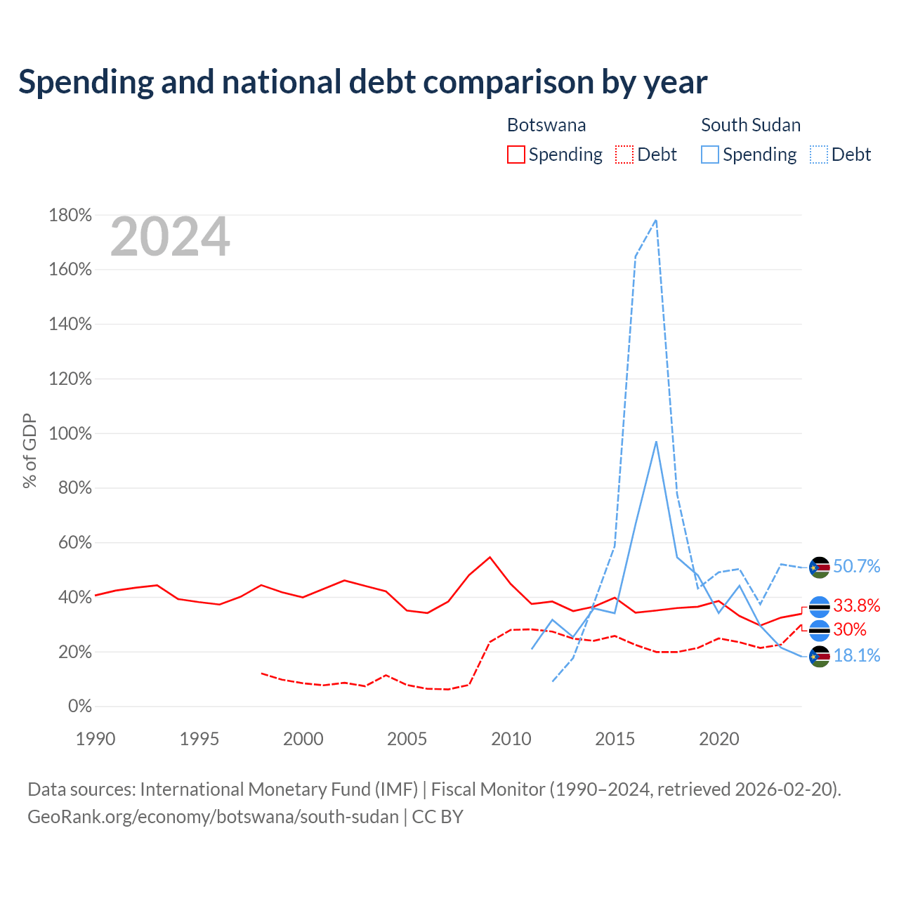 Botswana has $5.82B in government debt (30% of GDP), compared to $7.04B (50.7% of GDP) in South Sudan.