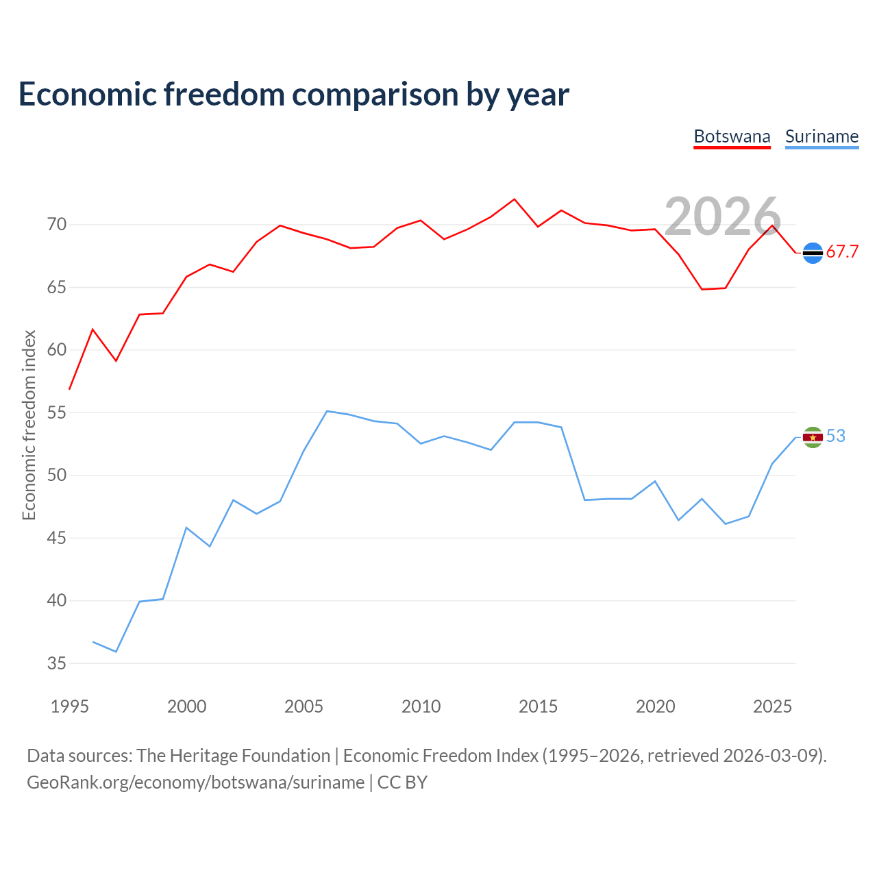 The Economic Freedom Index for Botswana is 67.7, ranking 53/197, compared to 53 for Suriname, ranking 143/197. The chart above displays a comparison of annual changes in economic freedom indexes.