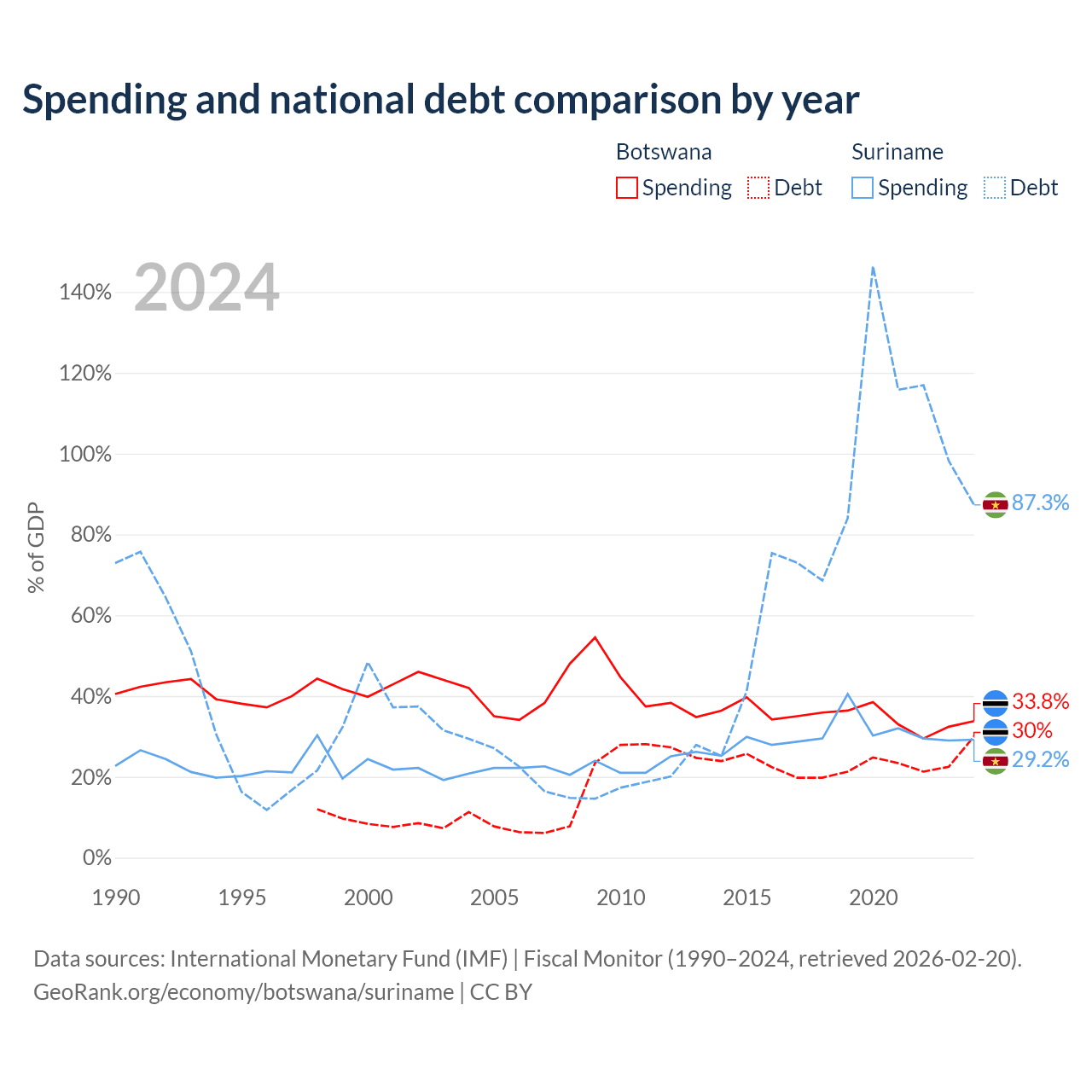 Botswana has $5.82B in government debt (30% of GDP), compared to $3.86B (87.3% of GDP) in Suriname.