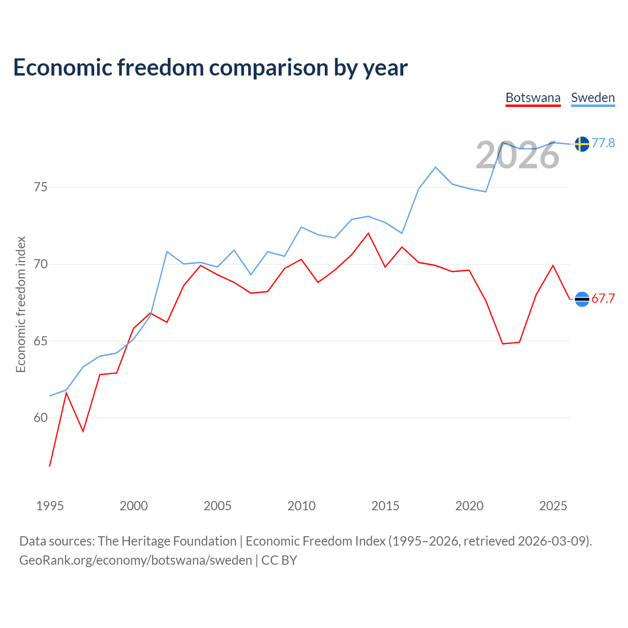 The Economic Freedom Index for Botswana is 67.7, ranking 53/197, compared to 77.8 for Sweden, ranking 14/197. The chart above displays a comparison of annual changes in economic freedom indexes.
