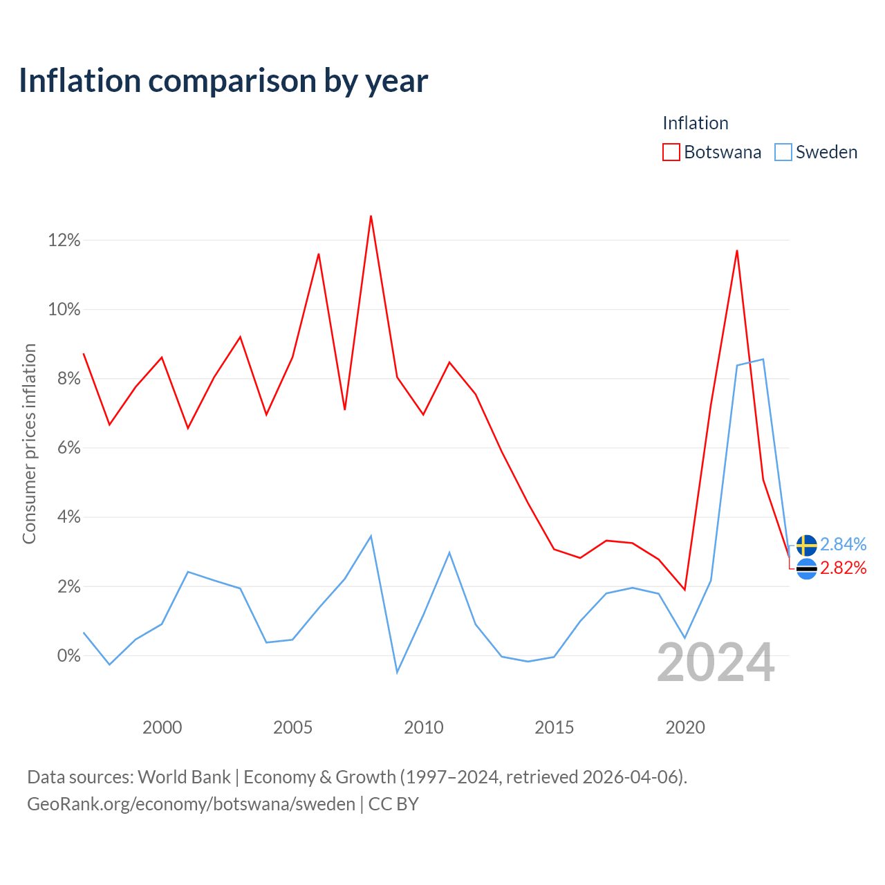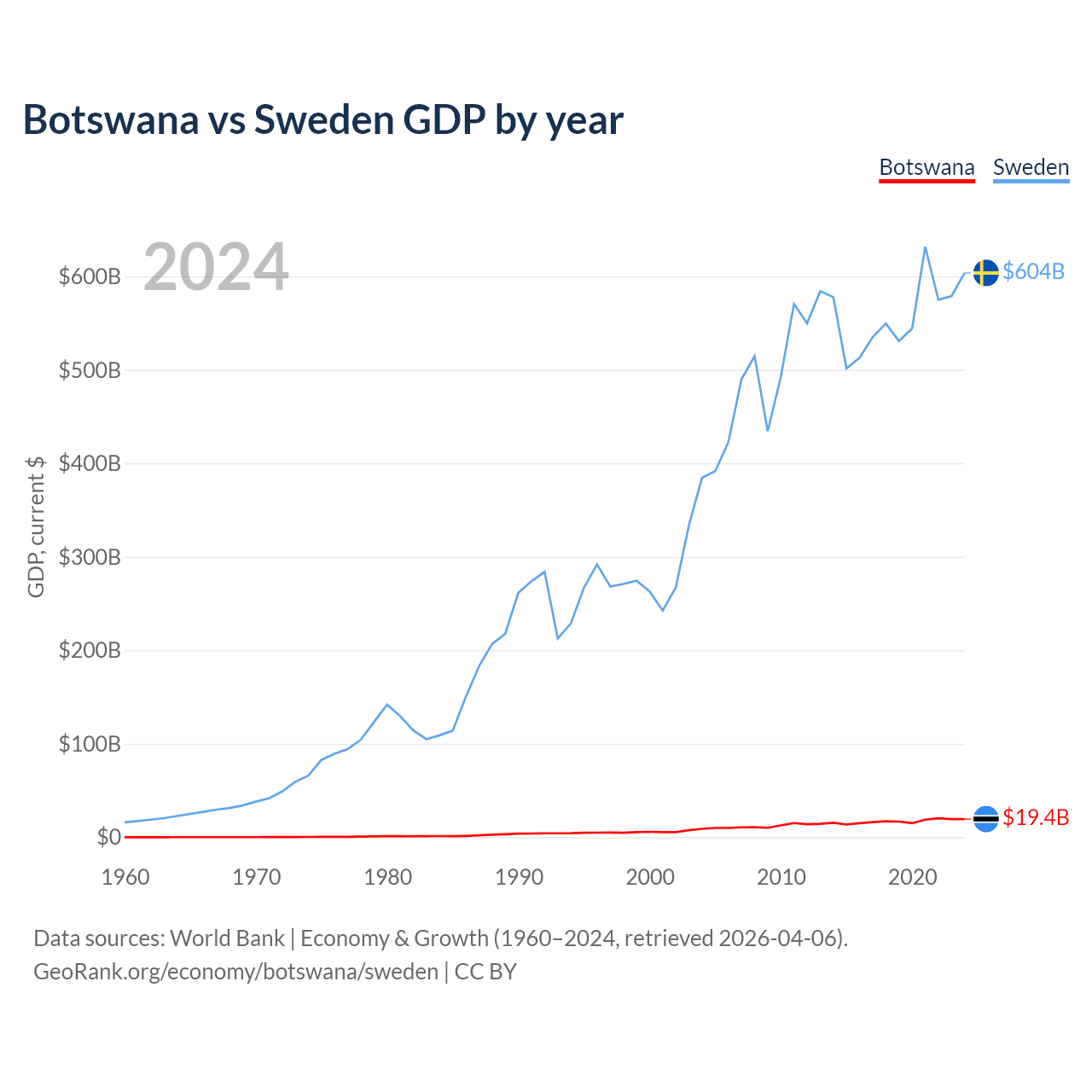Botswana has a GDP of $19.4B compared to $604B for Sweden, ranking 133/197 and 26/197 by economy size, respectively.