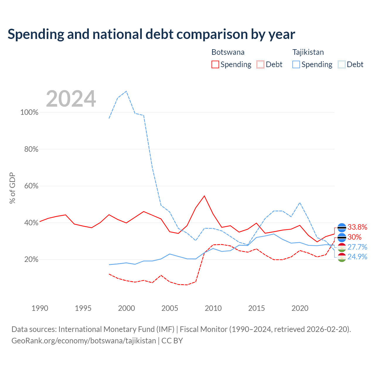 Botswana has $5.82B in government debt (30% of GDP), compared to $3.54B (24.9% of GDP) in Tajikistan.