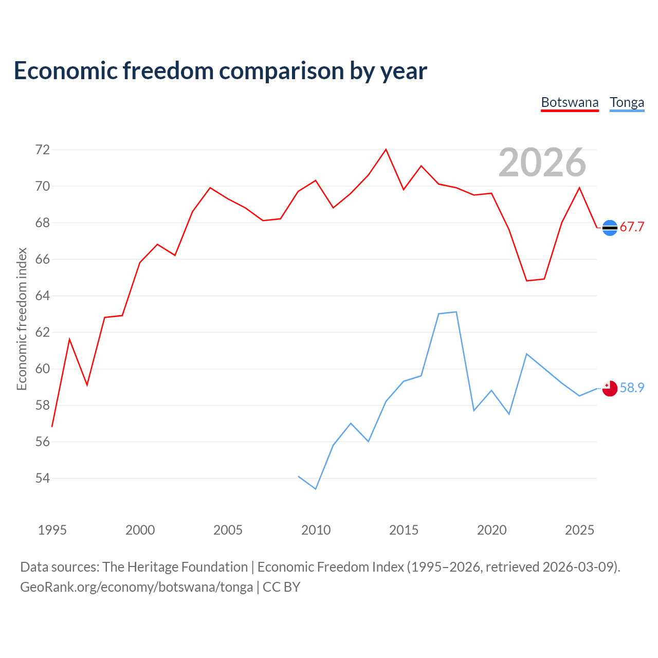 The Economic Freedom Index for Botswana is 67.7, ranking 53/197, compared to 58.9 for Tonga, ranking 107/197. The chart above displays a comparison of annual changes in economic freedom indexes.