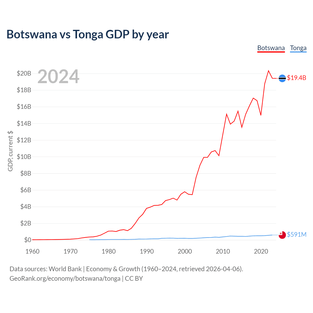 Botswana has a GDP of $19.4B compared to $591M for Tonga, ranking 133/197 and 191/197 by economy size, respectively.