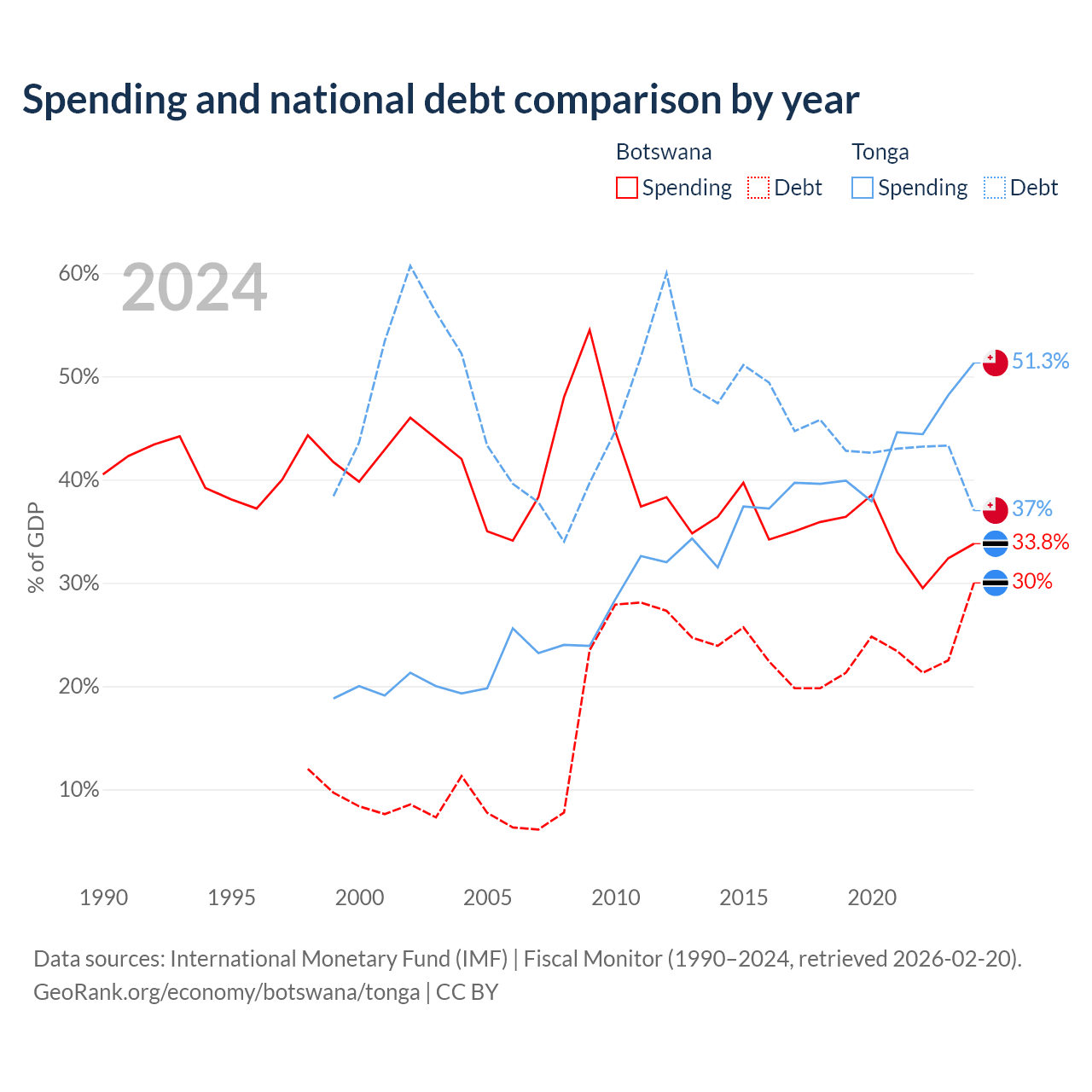 Botswana has $5.82B in government debt (30% of GDP), compared to $256M (37% of GDP) in Tonga.