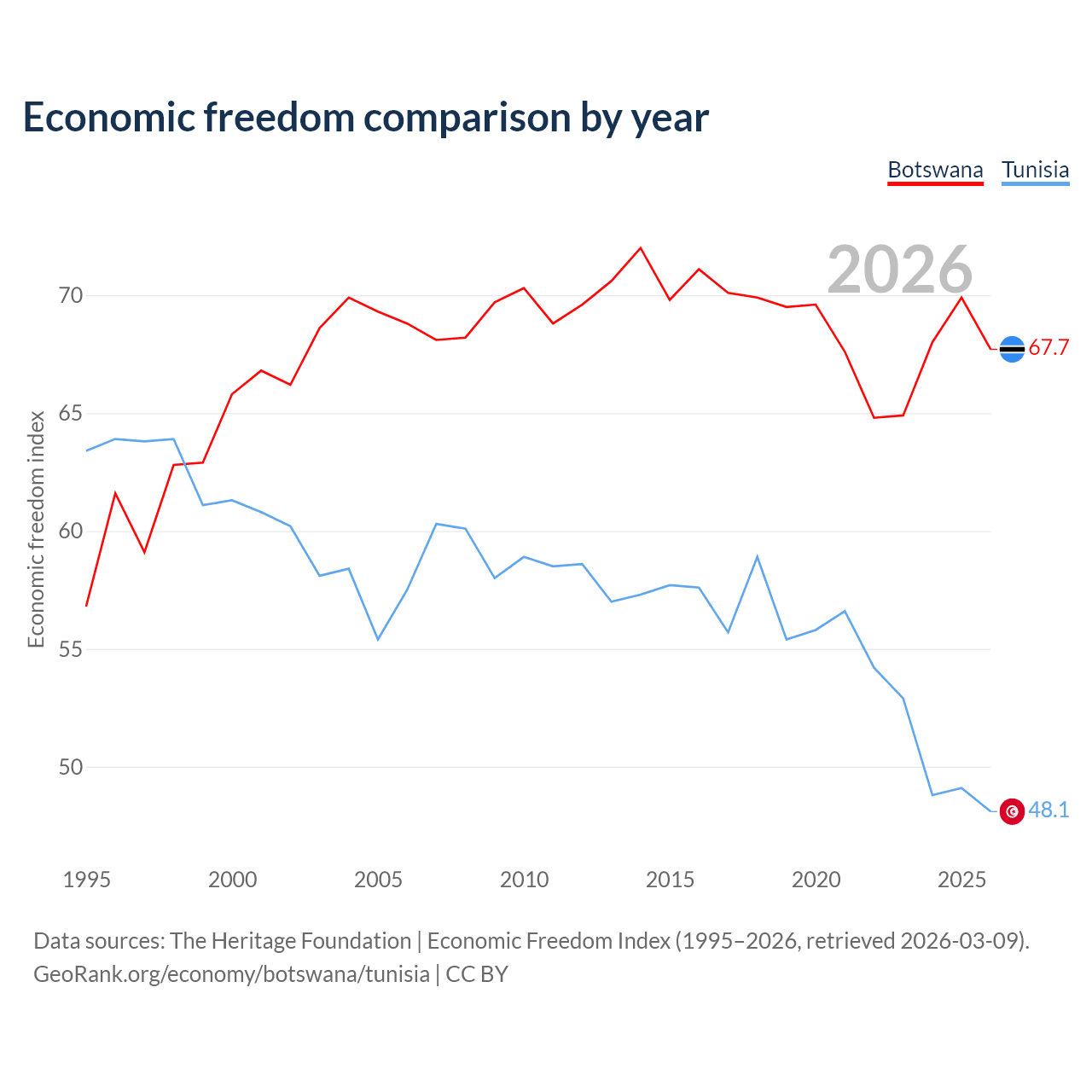 The Economic Freedom Index for Botswana is 67.7, ranking 53/197, compared to 48.1 for Tunisia, ranking 172/197. The chart above displays a comparison of annual changes in economic freedom indexes.