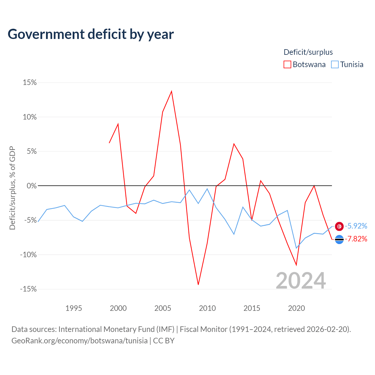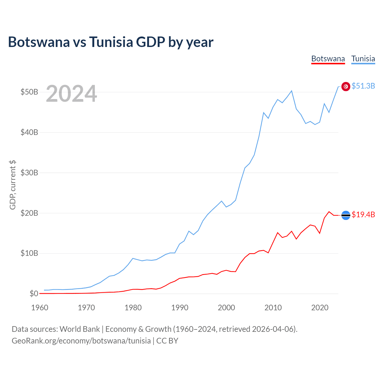 Botswana has a GDP of $19.4B compared to $51.3B for Tunisia, ranking 133/197 and 93/197 by economy size, respectively.