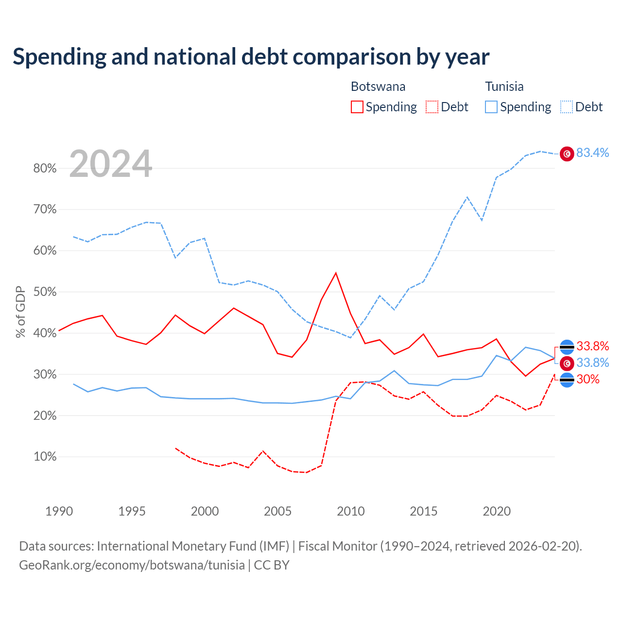 Botswana has $5.82B in government debt (30% of GDP), compared to $42.8B (83.4% of GDP) in Tunisia.