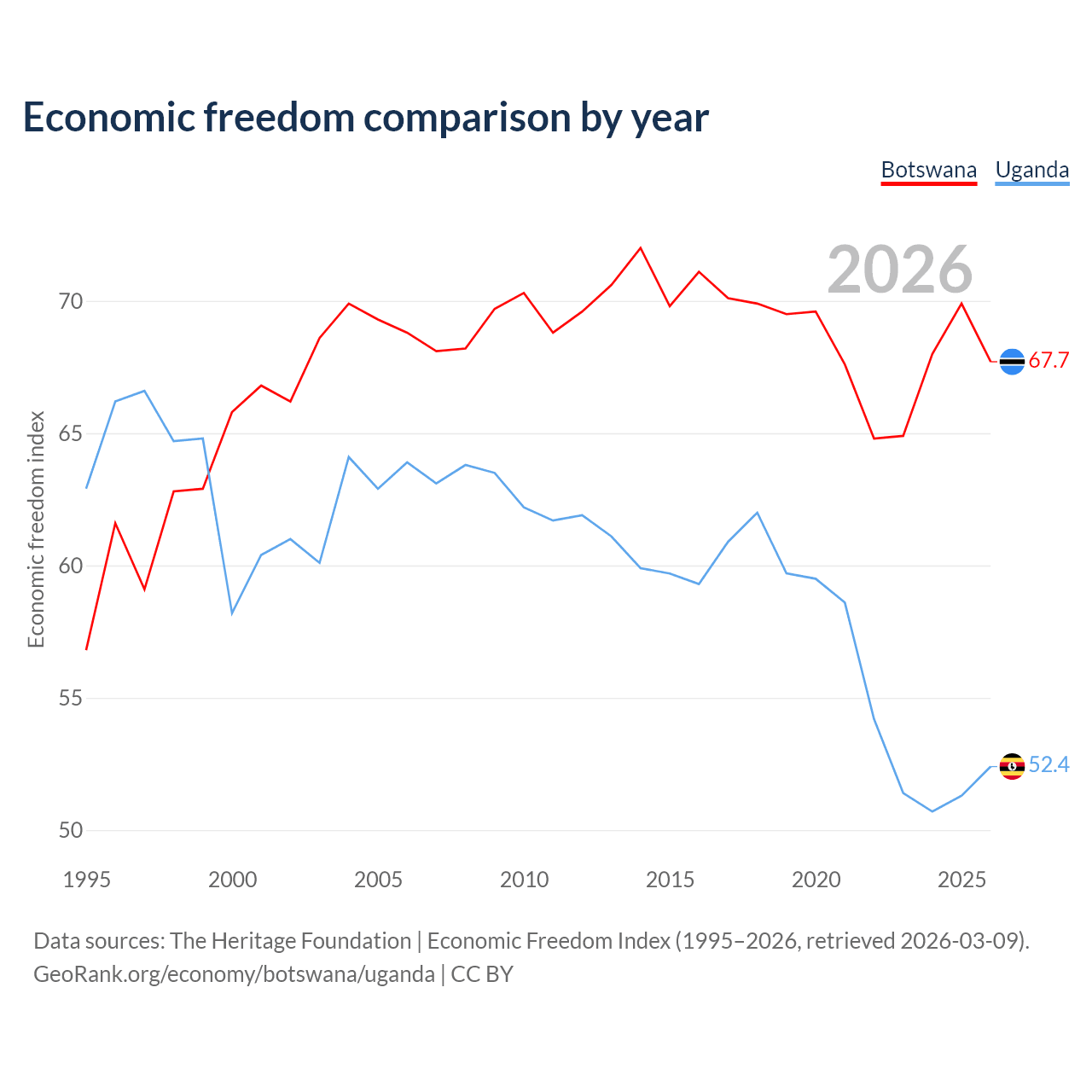 The Economic Freedom Index for Botswana is 67.7, ranking 53/197, compared to 52.4 for Uganda, ranking 149/197. The chart above displays a comparison of annual changes in economic freedom indexes.