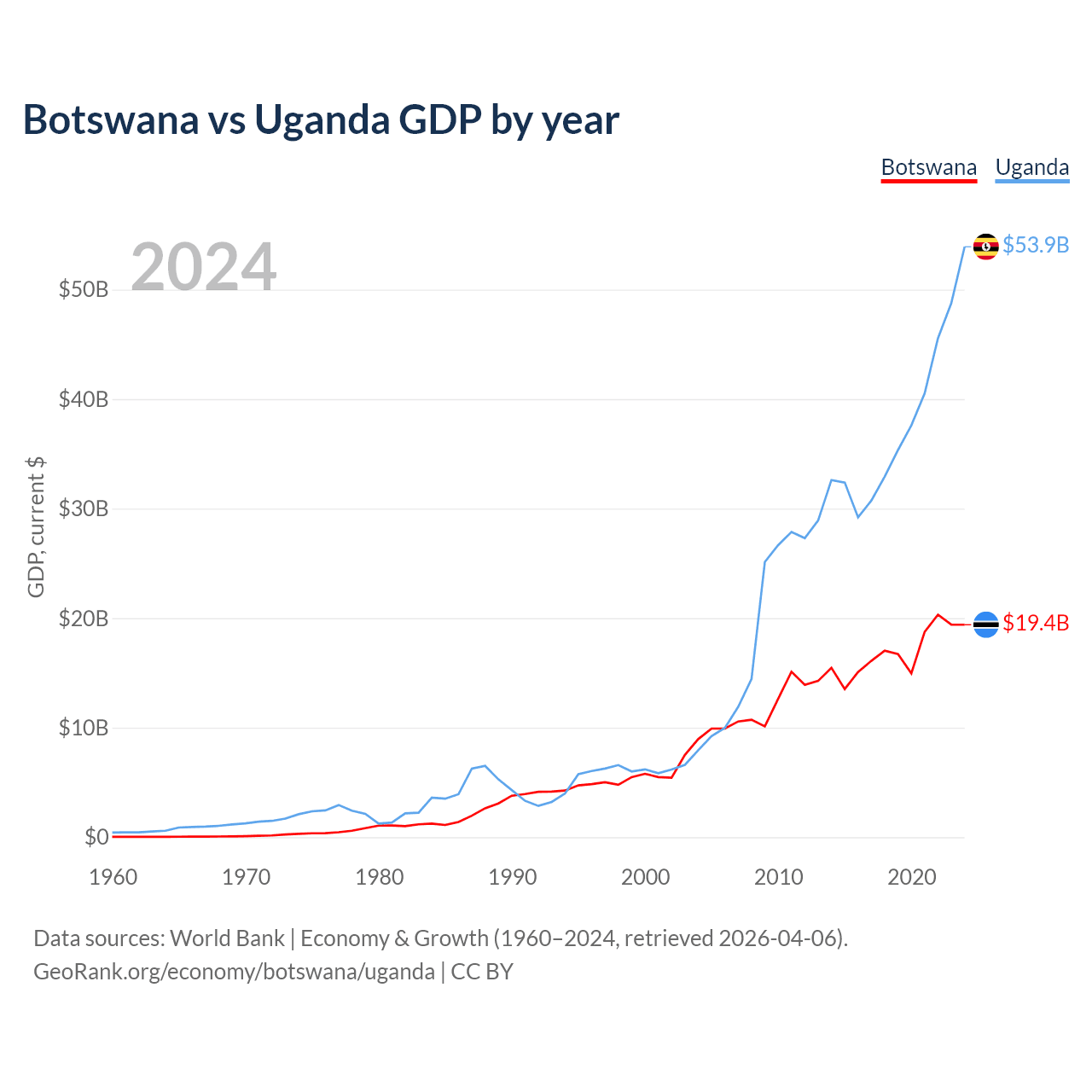 Botswana vs Uganda GDP by year