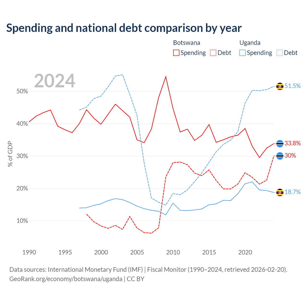 Botswana has $5.82B in government debt (30% of GDP), compared to $27.8B (51.5% of GDP) in Uganda.