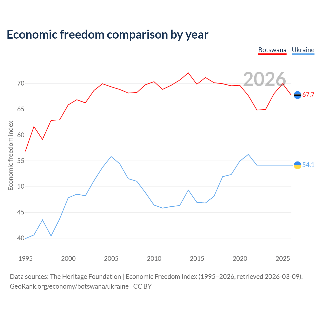 The Economic Freedom Index for Botswana is 67.7, ranking 53/197, compared to 54.1 for Ukraine, ranking 135/197. The chart above displays a comparison of annual changes in economic freedom indexes.