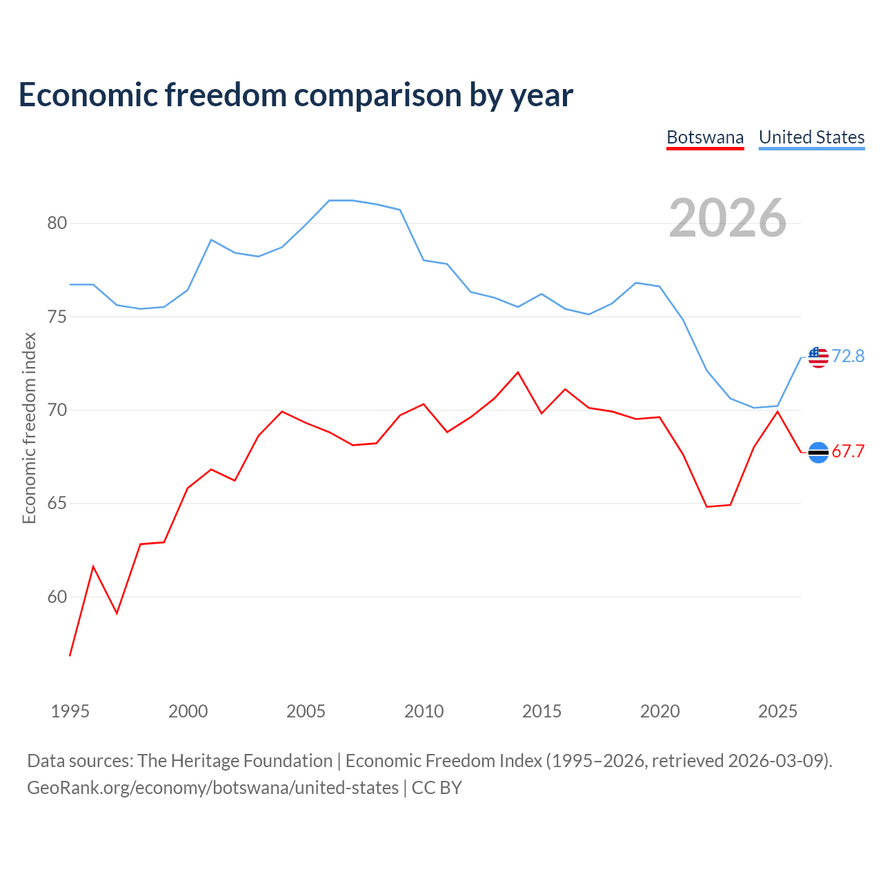 The Economic Freedom Index for Botswana is 67.7, ranking 53/197, compared to 72.8 for the United States, ranking 27/197. The chart above displays a comparison of annual changes in economic freedom indexes.