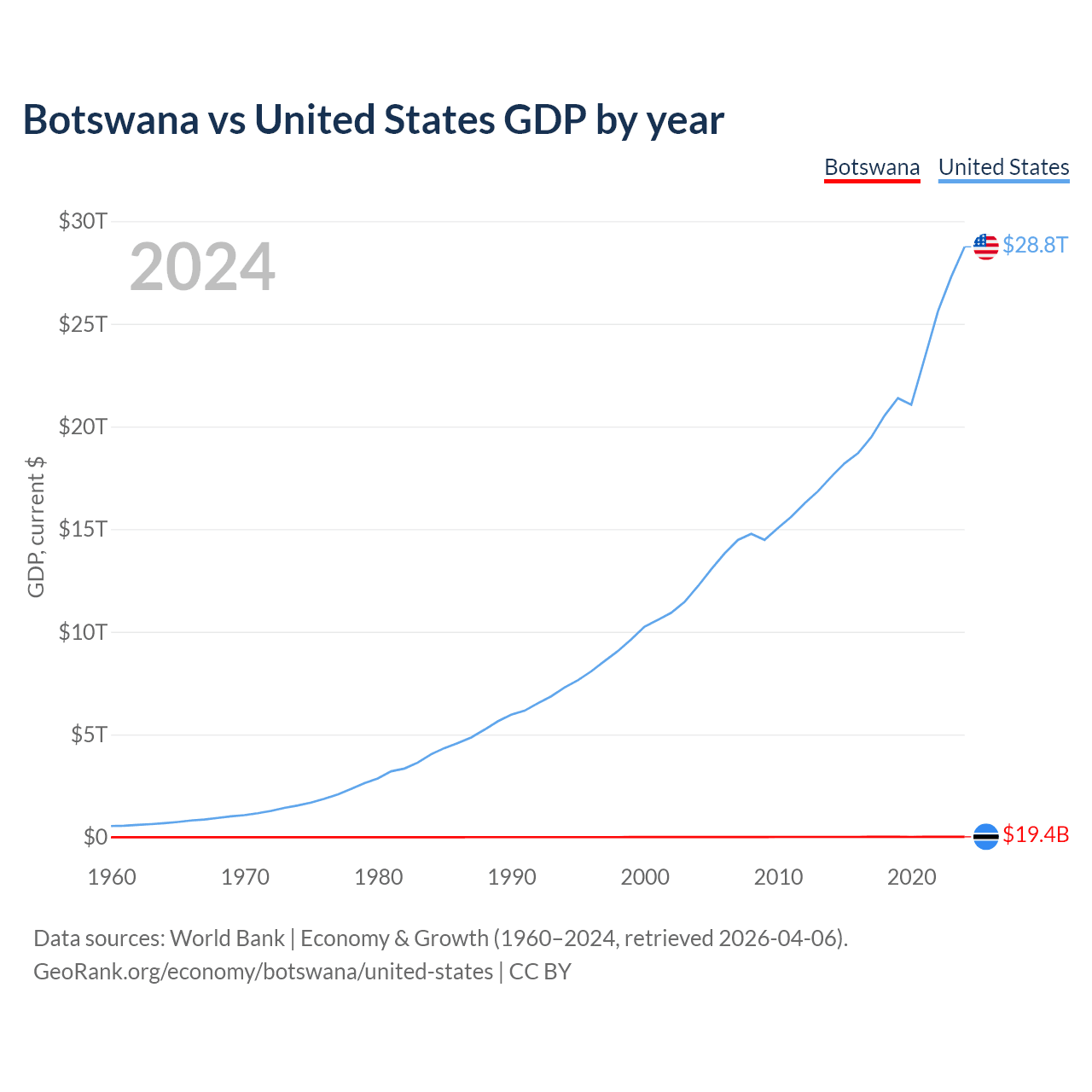 Botswana has a GDP of $19.4B compared to $28.8T for the United States, ranking 133/197 and 1/197 by economy size, respectively.