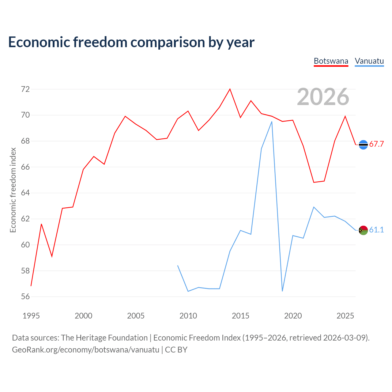 The Economic Freedom Index for Botswana is 67.7, ranking 53/197, compared to 61.1 for Vanuatu, ranking 92/197. The chart above displays a comparison of annual changes in economic freedom indexes.