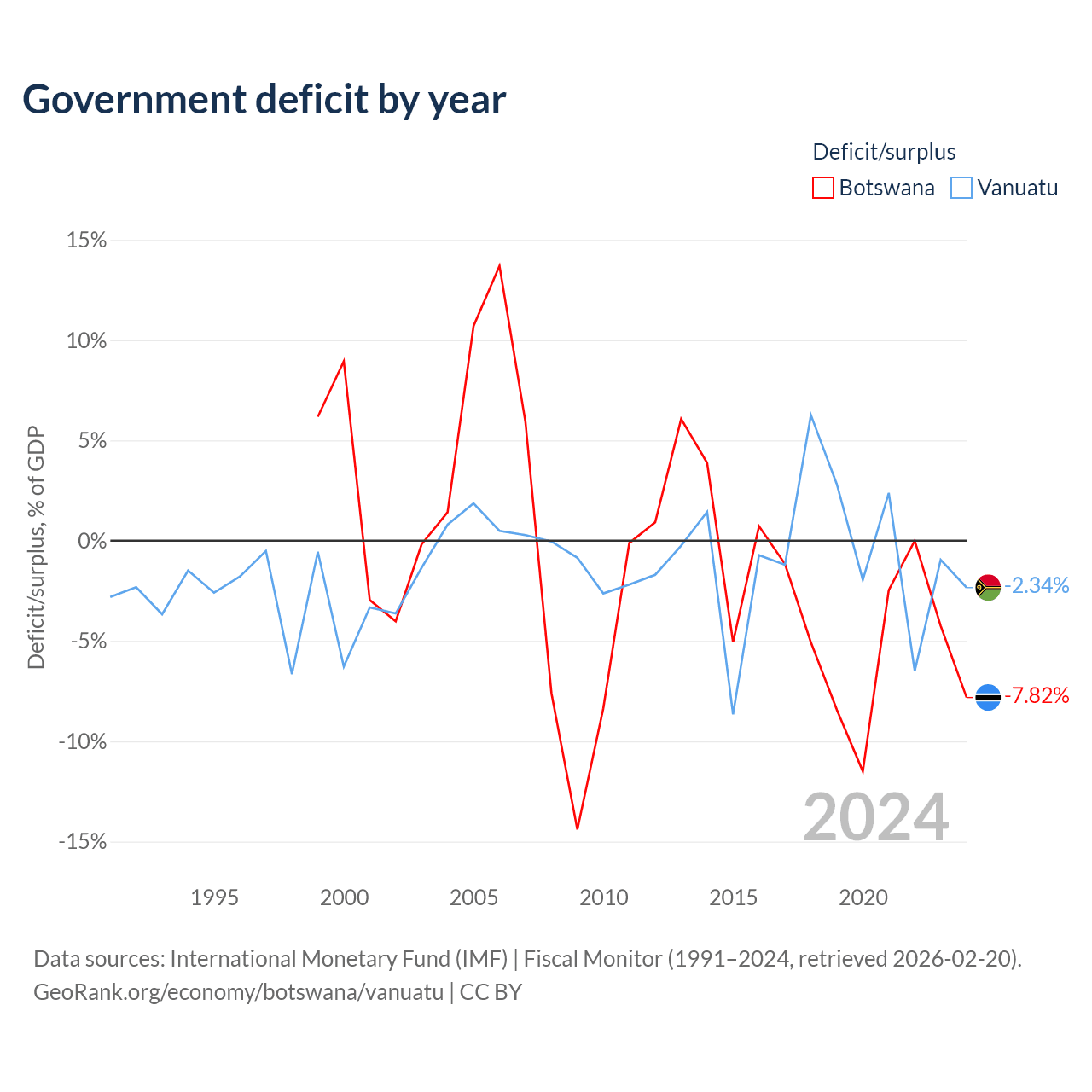 Botswana has a GDP of $19.4B compared to $1.12B for Vanuatu, ranking 133/197 and 188/197 by economy size, respectively.