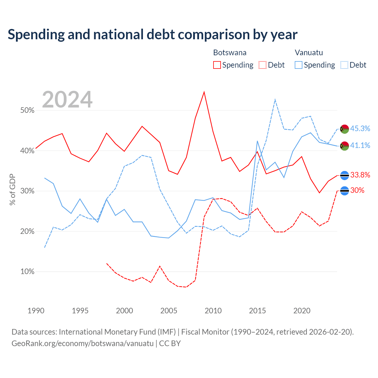 Botswana has $5.82B in government debt (30% of GDP), compared to $507M (45.3% of GDP) in Vanuatu.