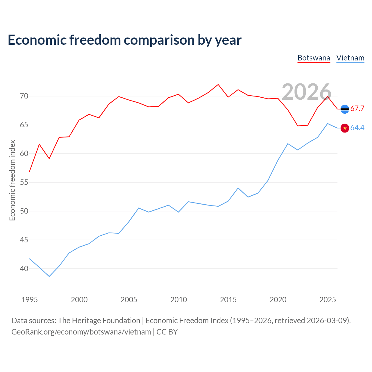 The Economic Freedom Index for Botswana is 67.7, ranking 53/197, compared to 64.4 for Vietnam, ranking 73/197. The chart above displays a comparison of annual changes in economic freedom indexes.