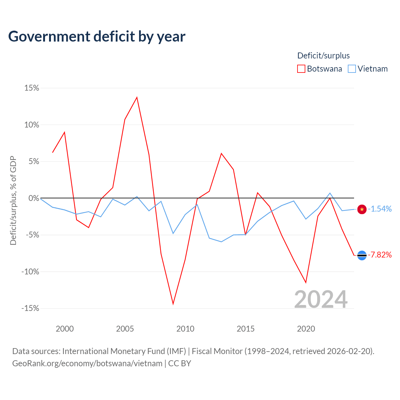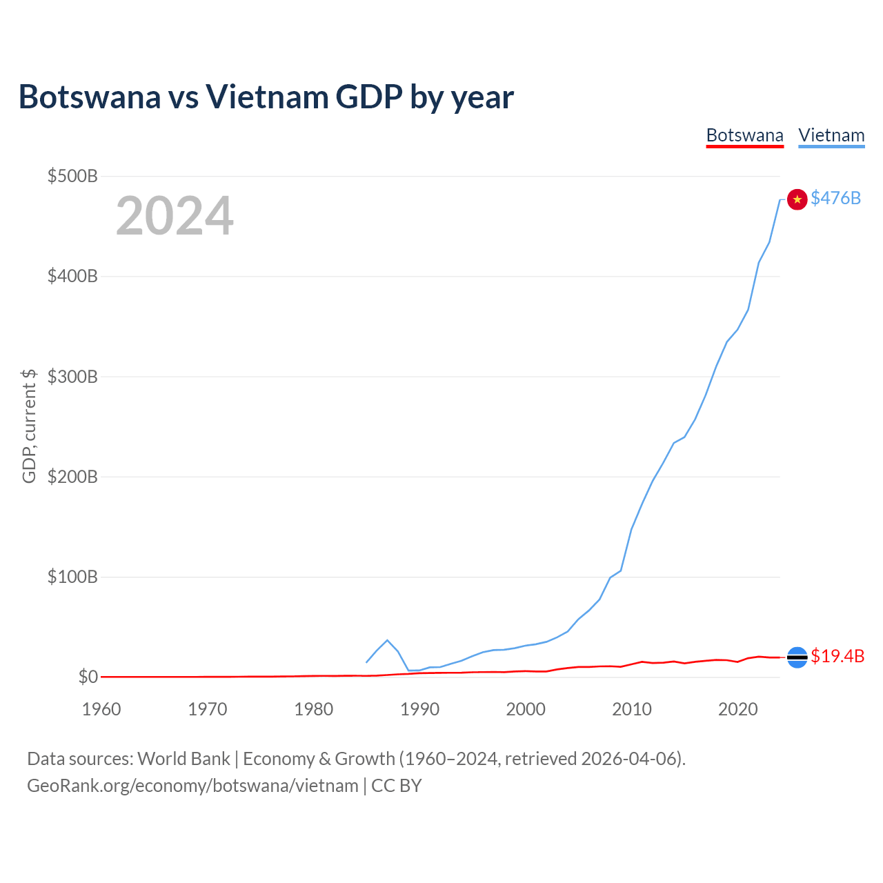 Botswana has a GDP of $19.4B compared to $476B for Vietnam, ranking 133/197 and 33/197 by economy size, respectively.