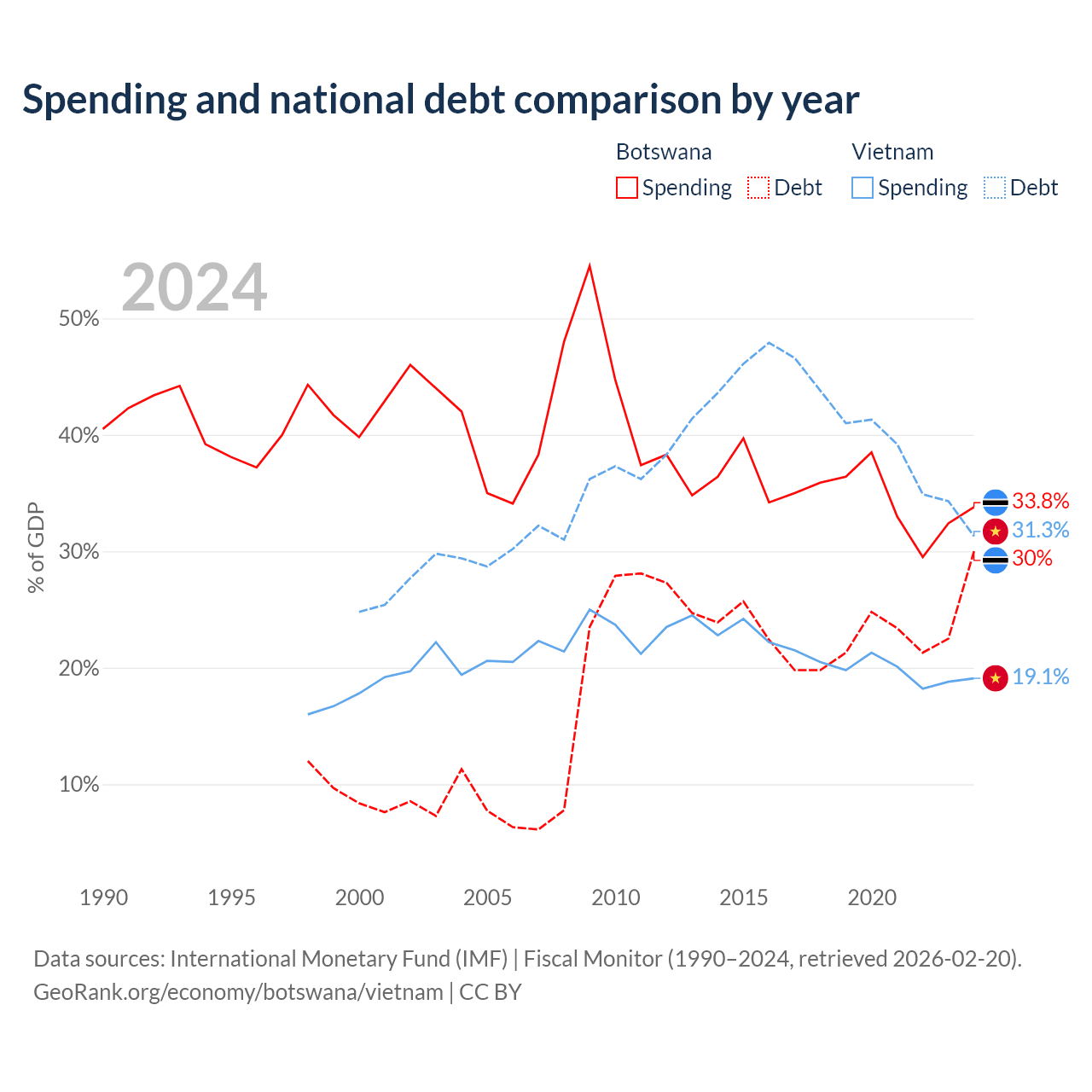 Botswana has $5.82B in government debt (30% of GDP), compared to $149B (31.3% of GDP) in Vietnam.