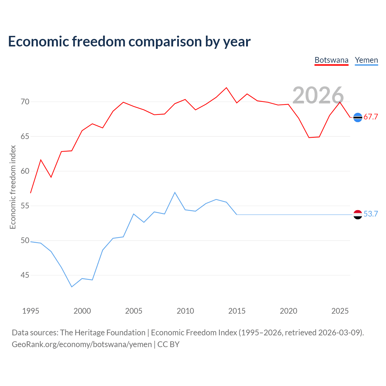 The Economic Freedom Index for Botswana is 67.7, ranking 53/197, compared to 53.7 for Yemen, ranking 138/197. The chart above displays a comparison of annual changes in economic freedom indexes.