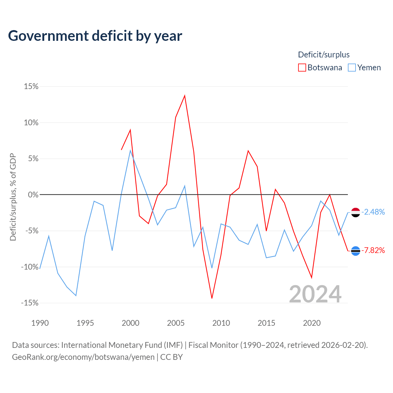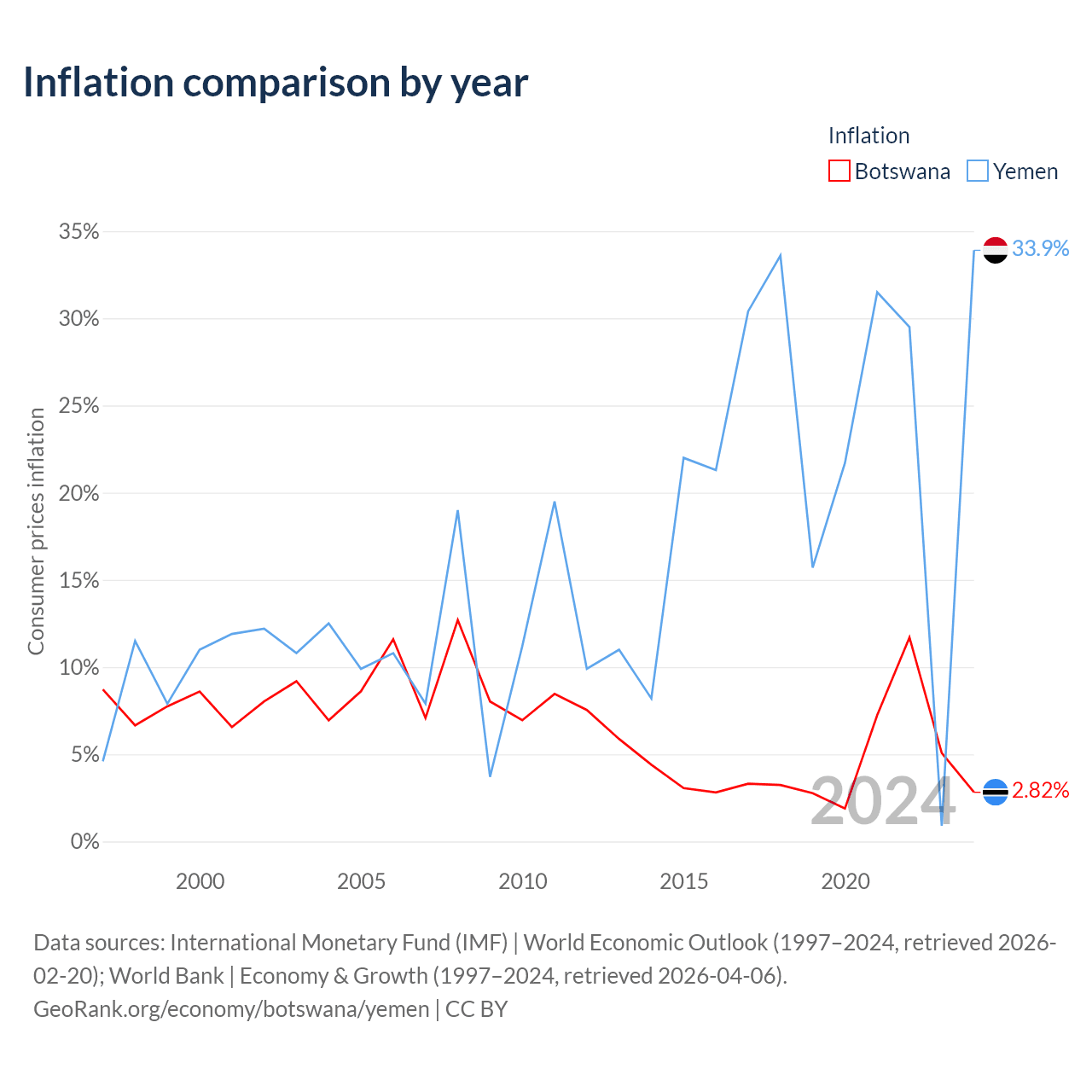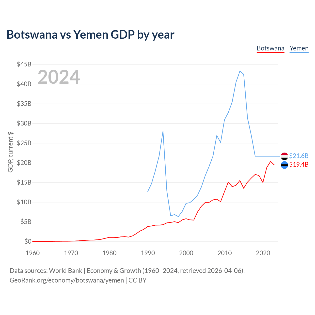 Botswana has a GDP of $19.4B compared to $21.6B for Yemen, ranking 133/197 and 125/197 by economy size, respectively.