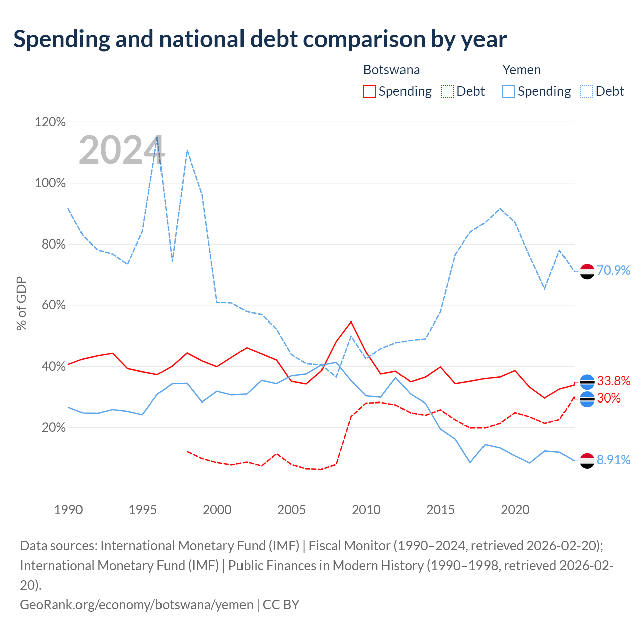 Botswana has $5.82B in government debt (30% of GDP), compared to $18.8B (70.9% of GDP) in Yemen.