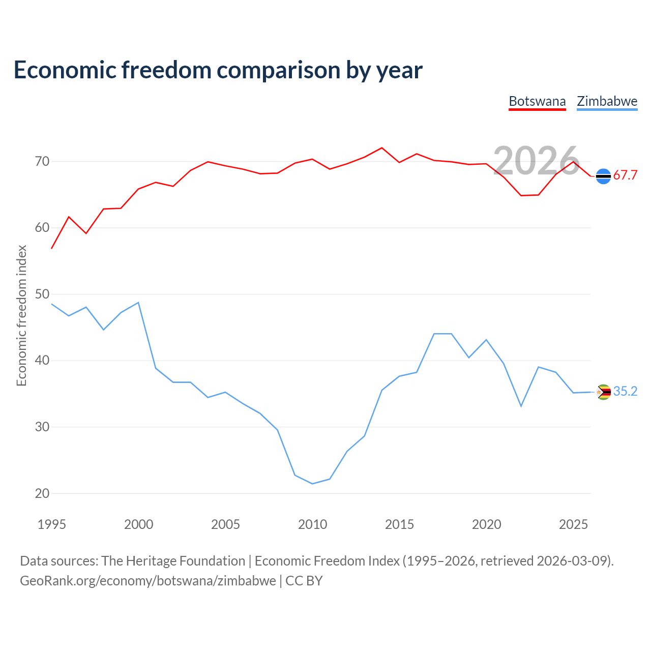 The Economic Freedom Index for Botswana is 67.7, ranking 53/197, compared to 35.2 for Zimbabwe, ranking 190/197. The chart above displays a comparison of annual changes in economic freedom indexes.
