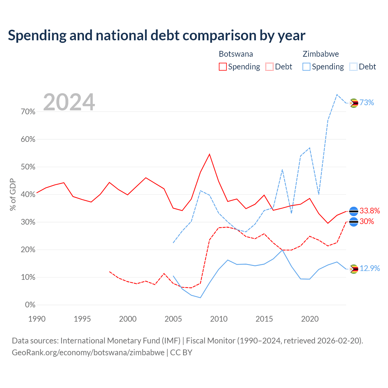 Botswana has $5.82B in government debt (30% of GDP), compared to $30.3B (73% of GDP) in Zimbabwe.