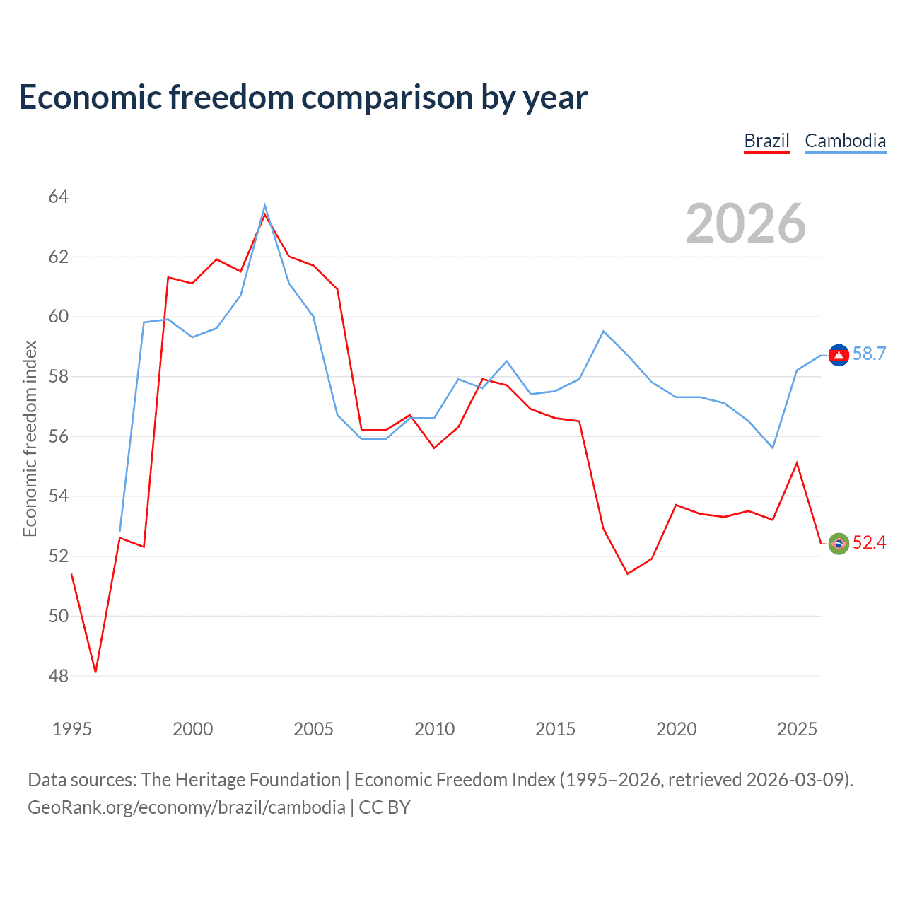 The Economic Freedom Index for Brazil is 52.4, ranking 148/197, compared to 58.7 for Cambodia, ranking 108/197. The chart above displays a comparison of annual changes in economic freedom indexes.