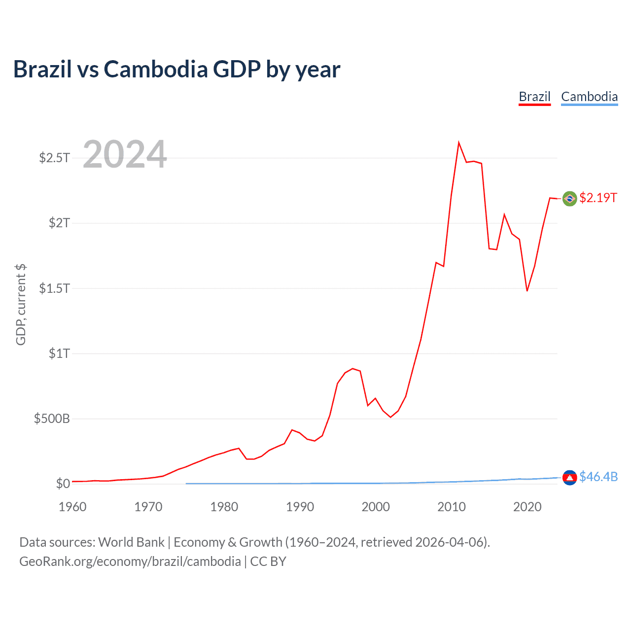 Brazil has a GDP of $2.19T compared to $46.4B for Cambodia, ranking 10/197 and 97/197 by economy size, respectively.