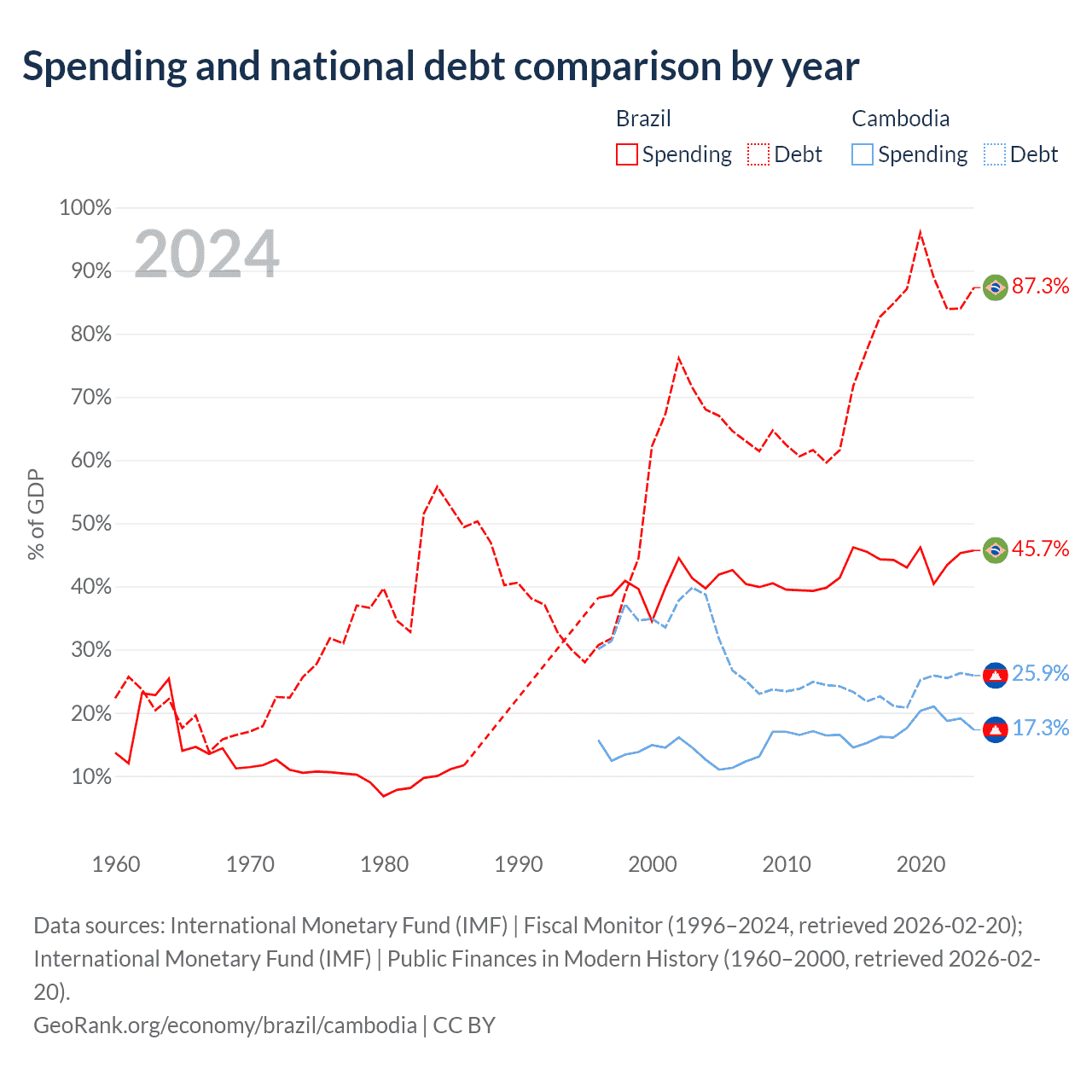 Brazil has $1.91T in government debt (87.3% of GDP), compared to $12B (25.9% of GDP) in Cambodia.