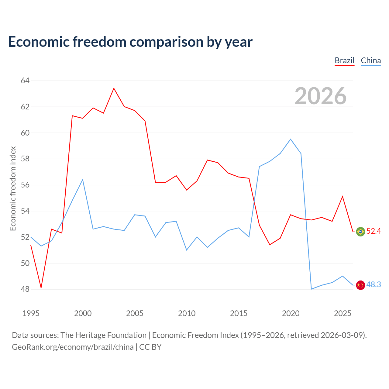 The Economic Freedom Index for Brazil is 52.4, ranking 148/197, compared to 48.3 for China, ranking 170/197. The chart above displays a comparison of annual changes in economic freedom indexes.