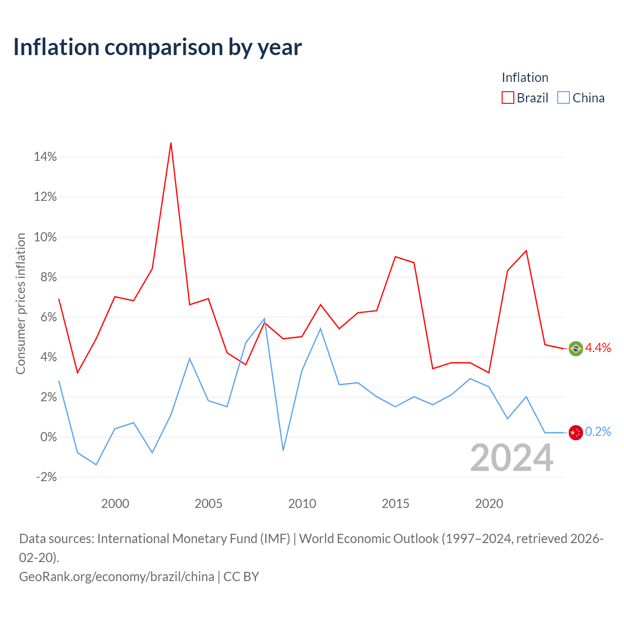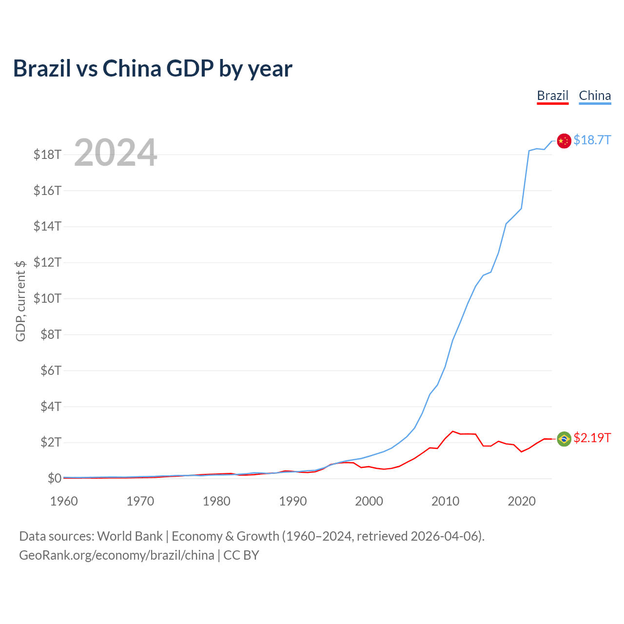 Brazil has a GDP of $2.19T compared to $18.7T for China, ranking 10/197 and 2/197 by economy size, respectively.
