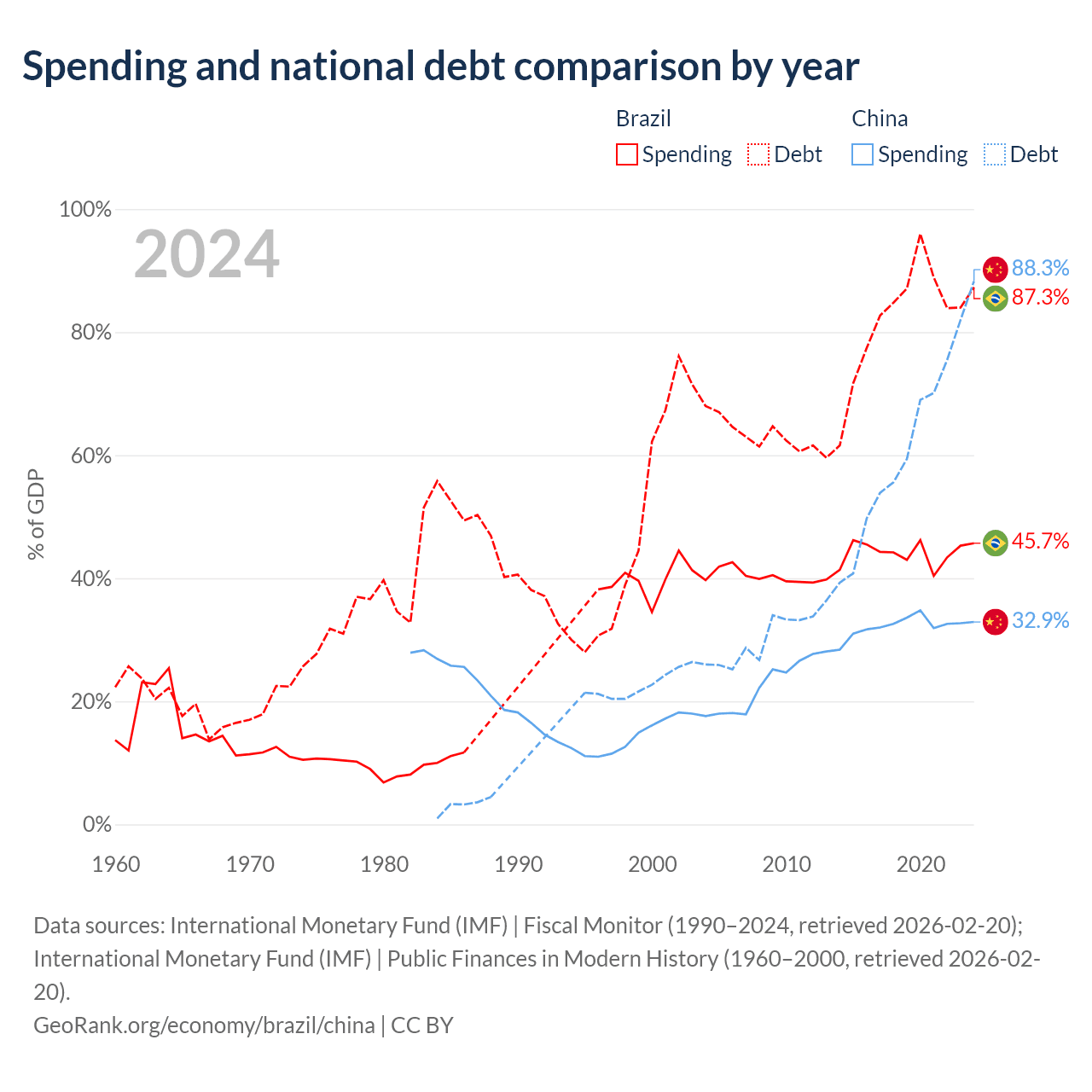 Brazil has $1.91T in government debt (87.3% of GDP), compared to $16.6T (88.3% of GDP) in China.