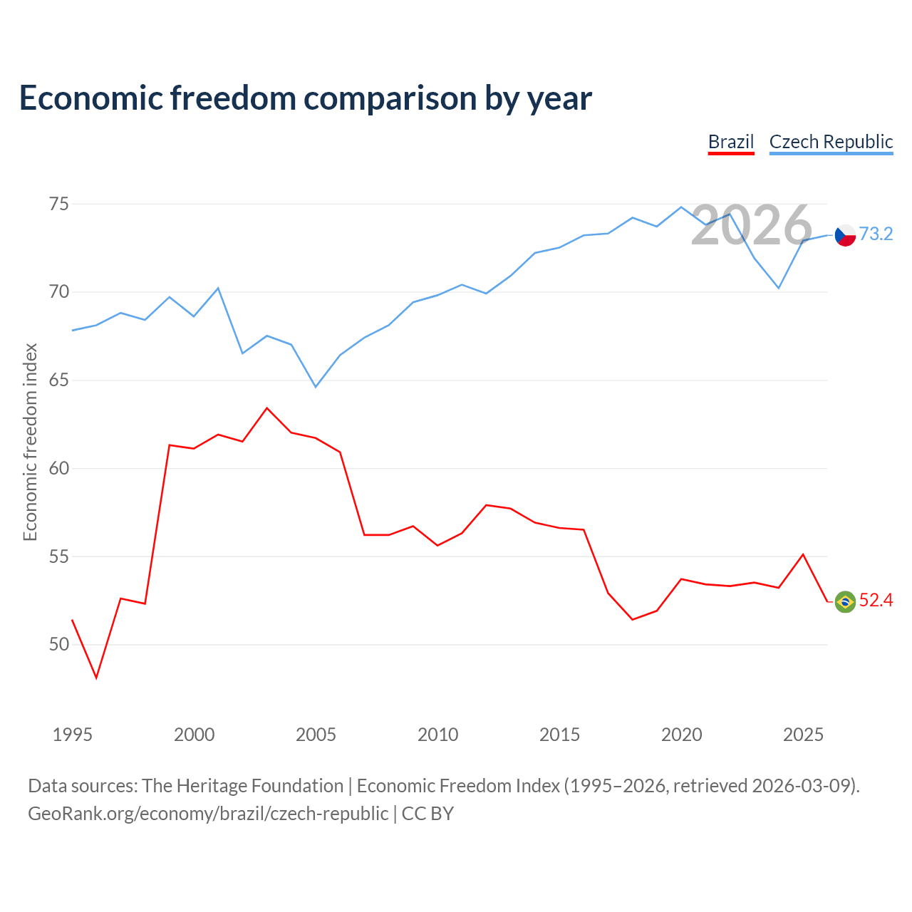 The Economic Freedom Index for Brazil is 52.4, ranking 148/197, compared to 73.2 for the Czech Republic, ranking 25/197. The chart above displays a comparison of annual changes in economic freedom indexes.