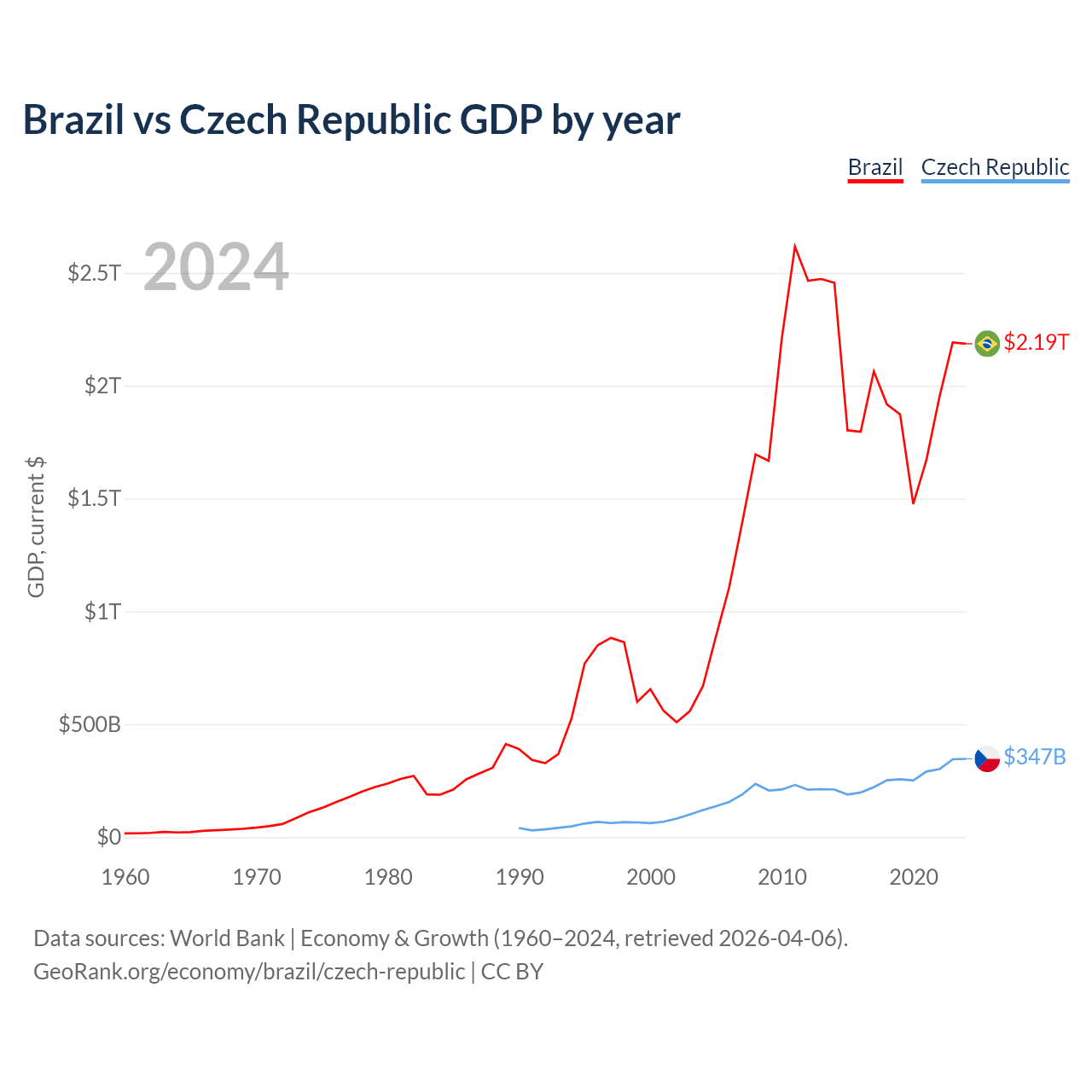Brazil has a GDP of $2.19T compared to $347B for the Czech Republic, ranking 10/197 and 44/197 by economy size, respectively.