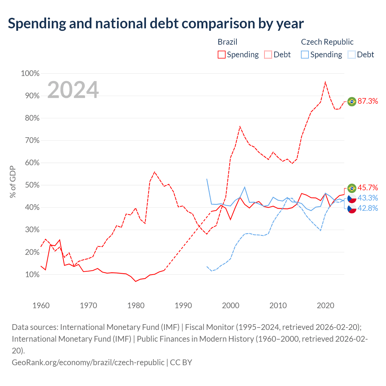 Brazil has $1.91T in government debt (87.3% of GDP), compared to $150B (43.3% of GDP) in the Czech Republic.