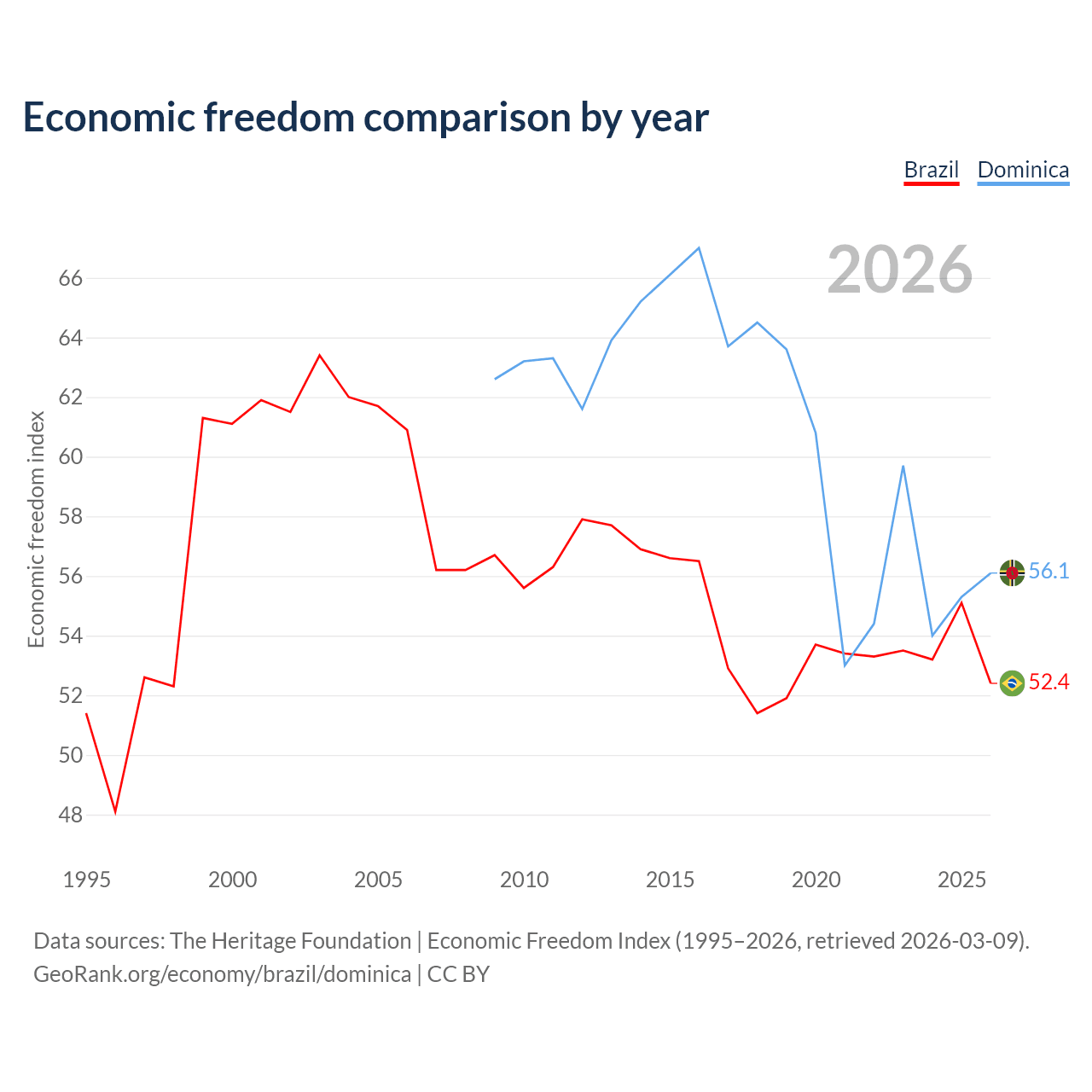 The Economic Freedom Index for Brazil is 52.4, ranking 148/197, compared to 56.1 for Dominica, ranking 124/197. The chart above displays a comparison of annual changes in economic freedom indexes.