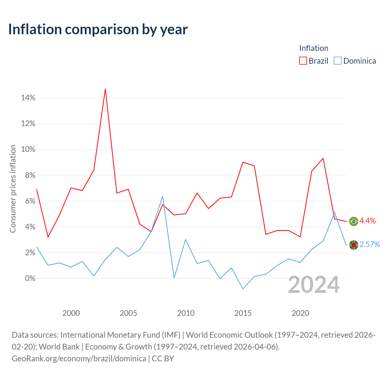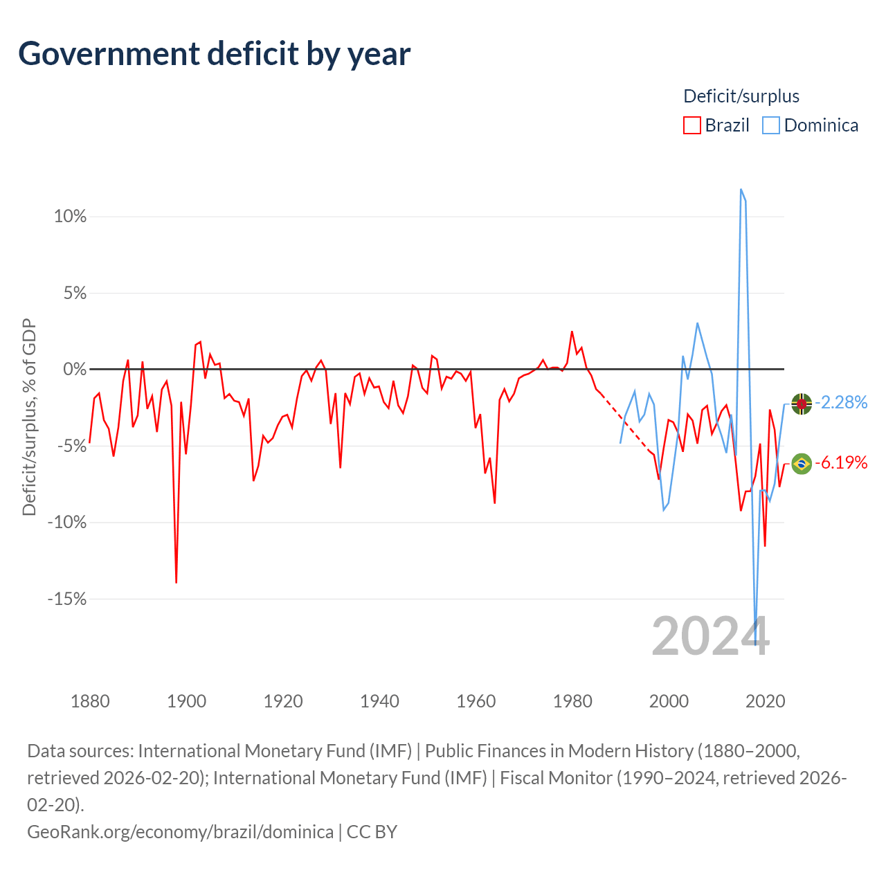 Brazil has a GDP of $2.19T compared to $689M for Dominica, ranking 10/197 and 190/197 by economy size, respectively.