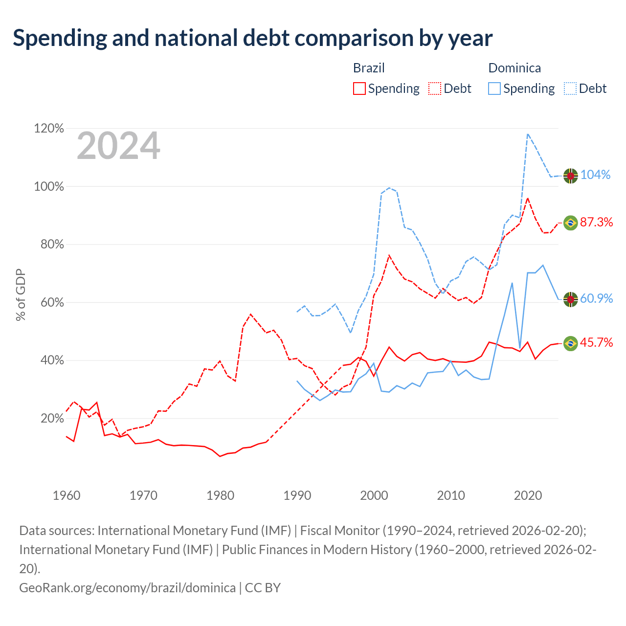 Brazil has $1.91T in government debt (87.3% of GDP), compared to $713M (103.5% of GDP) in Dominica.