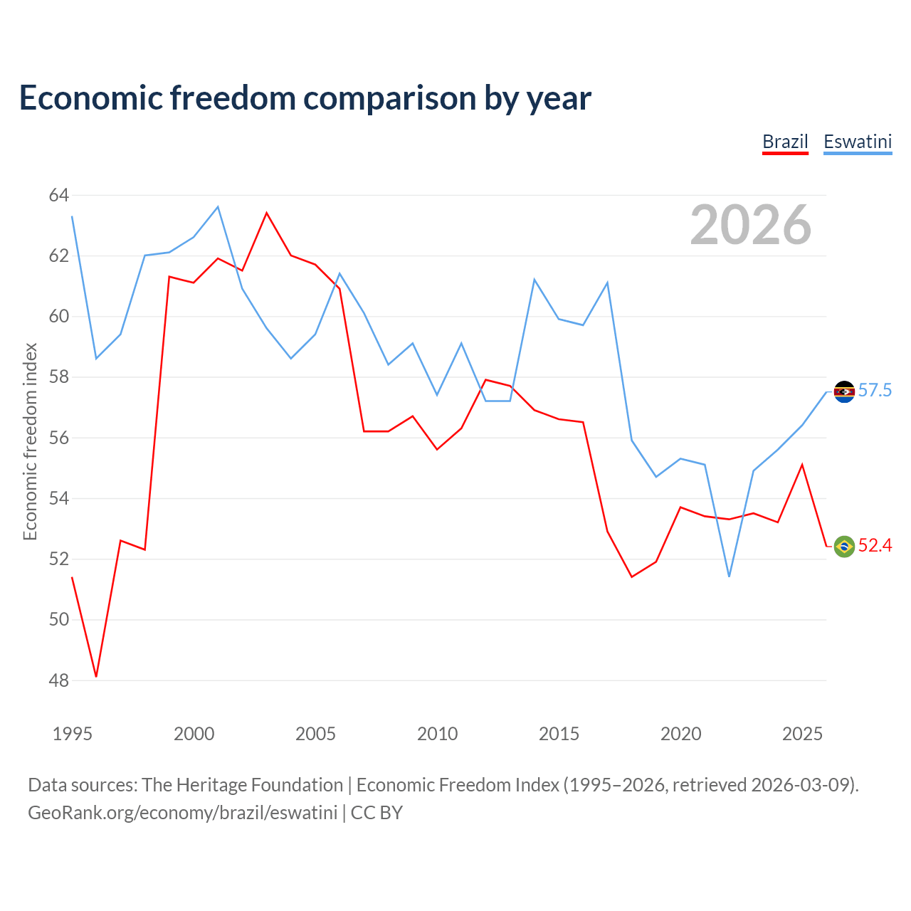 The Economic Freedom Index for Brazil is 52.4, ranking 148/197, compared to 57.5 for Eswatini, ranking 116/197. The chart above displays a comparison of annual changes in economic freedom indexes.