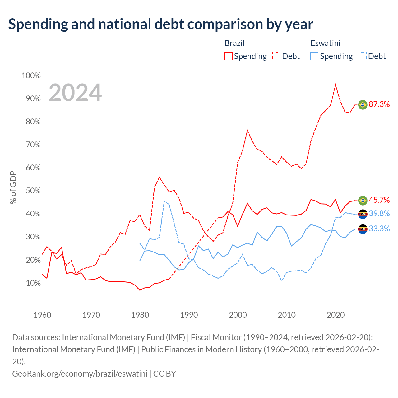 Brazil has $1.91T in government debt (87.3% of GDP), compared to $1.93B (39.8% of GDP) in Eswatini.