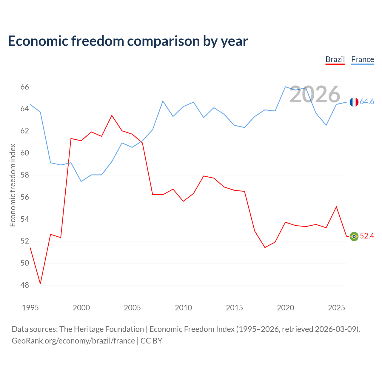 The Economic Freedom Index for Brazil is 52.4, ranking 148/197, compared to 64.6 for France, ranking 72/197. The chart above displays a comparison of annual changes in economic freedom indexes.