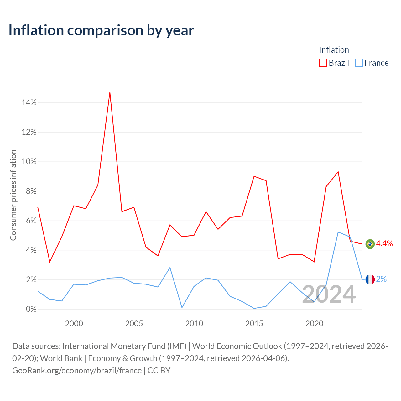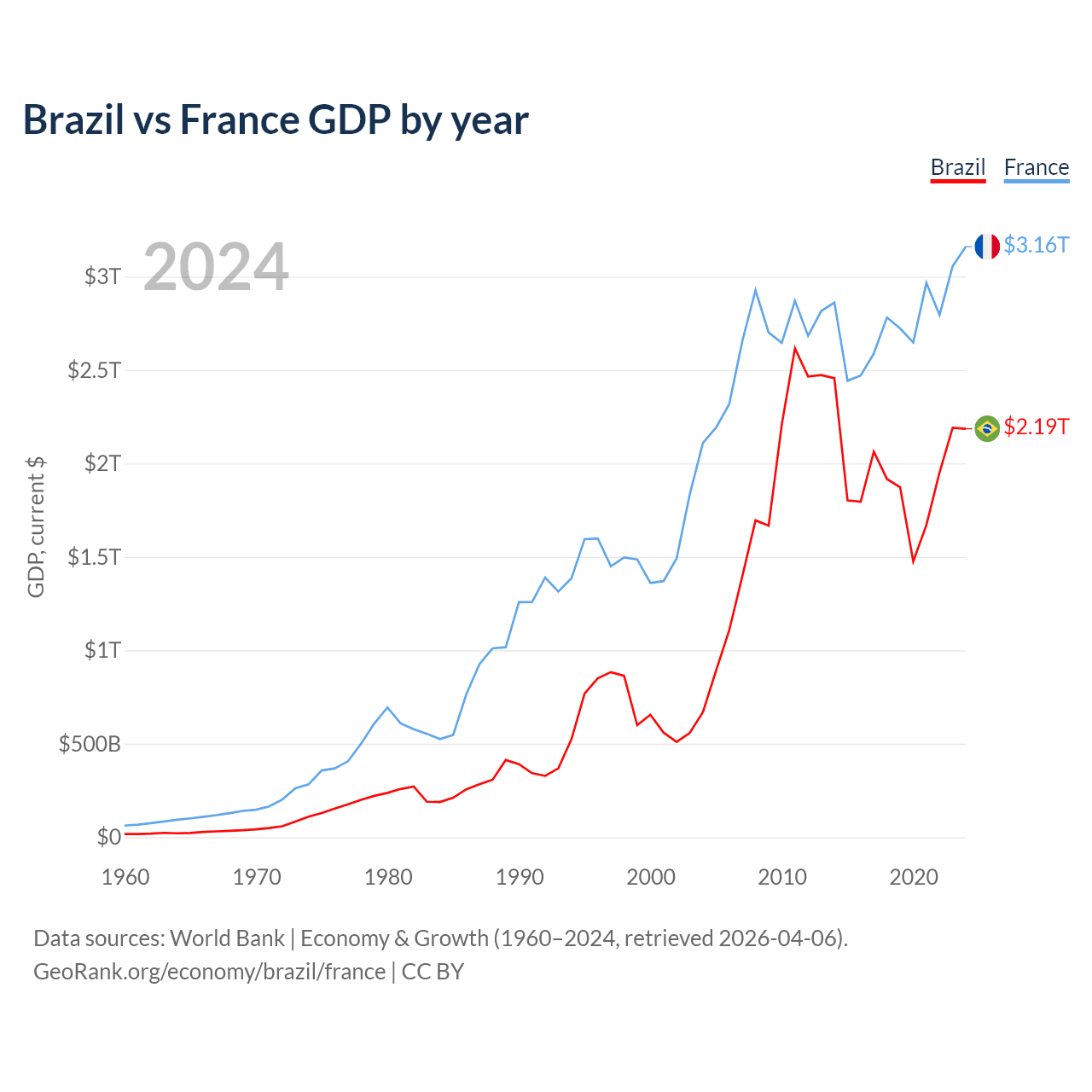 Brazil has a GDP of $2.19T compared to $3.16T for France, ranking 10/197 and 7/197 by economy size, respectively.