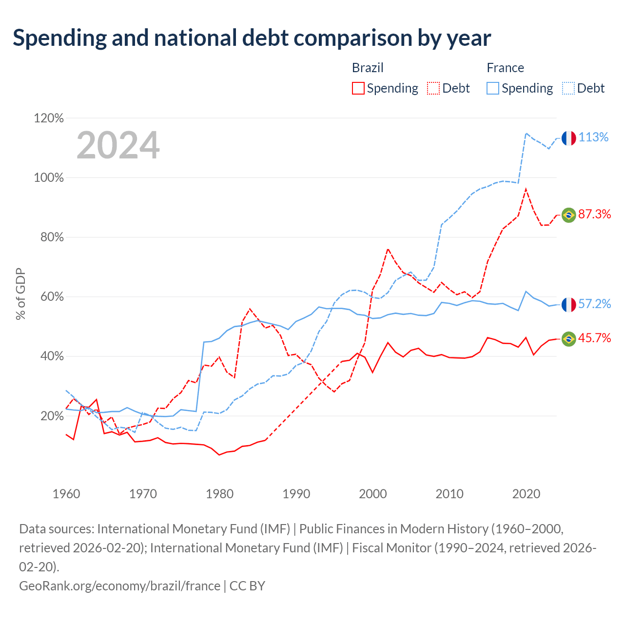 Brazil has $1.91T in government debt (87.3% of GDP), compared to $3.58T (113.1% of GDP) in France.